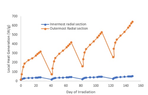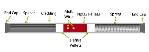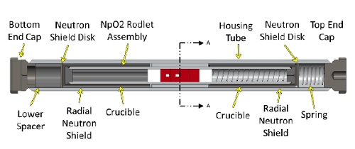 Наработка 238Pu в США - экспериментальная программа AtomInfo.Ru, ОПУБЛИКОВАНО 01.09.2019 В феврале 2019 года в Ричланде (США) прошла конференция американского ядерного общества, посвящённая различным вопросам применения ядерных технологий в космосе. Один из докладов (авторы - J.L.McDuffee и др.) был посвящён вопросам разработки нептуниевых мишеней для наработки пдутония-238. Выбор материала мишени Для наработки 238Pu - изотопа, активно применяющегося в космических радиоизотопных генераторах - в Окриджской национальной лаборатории (США) применяются керметные мишени (таблетки) из NpO2-алюминия. Первыми в США такую технологию освоили на комплексе "Саванна-Ривер", и там же был накоплен значительный технологический опыт. К преимуществам использования керамических мишеней относится их высокая теплопроводность, что позволяет поддерживать более низкую температуру при облучении мишени, а также упрощает процесс удаления химическими способами алюминия. Недостатком таких мишеней считается низкая температура плавления алюминия по сравнению с температурой плавления диоксида нептуния. На практике это приводит к ограничениям по загрузке нептуния в мишень. Кроме того, с удаляемым алюминием необходимо обращаться как с радиоактивными отходами, а это приводит к дополнительным финансовым затратам. Авторы доклада остановились на исследованиях по применению мишеней из чистого NpO2. Переход на такие мишени позволит увеличить наработку плутония-238 и сократит объёмы РАО, однако потребуется устранить технические сложности, связанные с низкой теплопроводностью и высокой теплопроизводительностью диоксида нептуния Работы, о которых было рассказано в докладе, включали в себя как теоретическую подготовку, так и практическую часть - облучение мишеней на реакторе HFIR. Кроме того, как отмечено в докладе, к экспериментальной программе подключится и реактор ATR. Первый этап Авторы отмечают, что документальные материалы об опыте облучения таблеток с чистым NpO2 отсутствуют. Поэтому экспериментальная программа была разбита на два этапа. На первом (Phase I) проект мишени был разработан, исходя из консервативного подхода. На втором этапе (Phase II) часть консерватизма удалось снять по мере набора экспериментальных результатов. Мишень на первом этапе представляла собой трубку (rodlet assembly) из циркалоя-4, внутрь которой помещались четыре таблетки из NpO2. Диаметр трубки близок к диаметрам твэлов легководных реакторов. Нептуниевые таблетки с двух сторон ограничены таблетками из гафния. Нижняя часть трубки заполнена молибденовым вытеснителем, верхняя - пружиной из нержавеющей стали. Контроль температурного режима осуществлялся при помощи melt wire из Ir-40Pt, имеющей хорошо известную температуру плавления. Между нептуниевыми таблетками и оболочкой предусмотрен небольшой зазор. Для дополнительной защиты мишень помещалась в трубку большего диаметра (capsule assembly), выполненную из алюминиевого сплава. Также были предприняты инженерные меры для недопущения потерей нептуния в случае расплавления таблеток мишени. Rodlet assembly ![]() Capsule assembly ![]() Нейтронно-физические расчёты мишеней проводились с использованием кодов MCNP и ORIGEN, а также ряда вспомогательных программ. Данные по сечениям брались из файла ENDF/B-VII.1. Расчёты показали значительный градиент тепловыделения по радиусу нептуниевой таблетки - от 50 Вт/г в ц