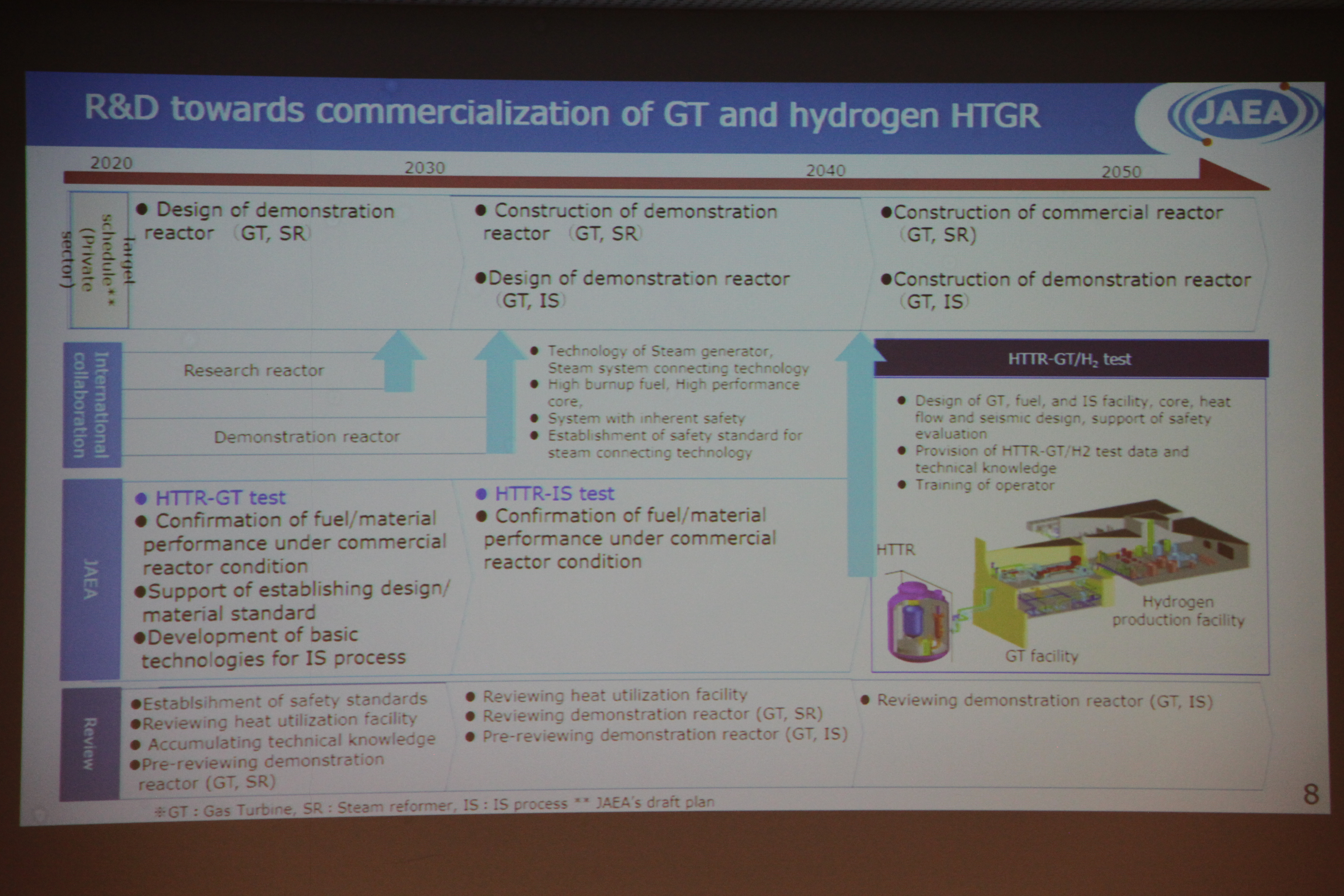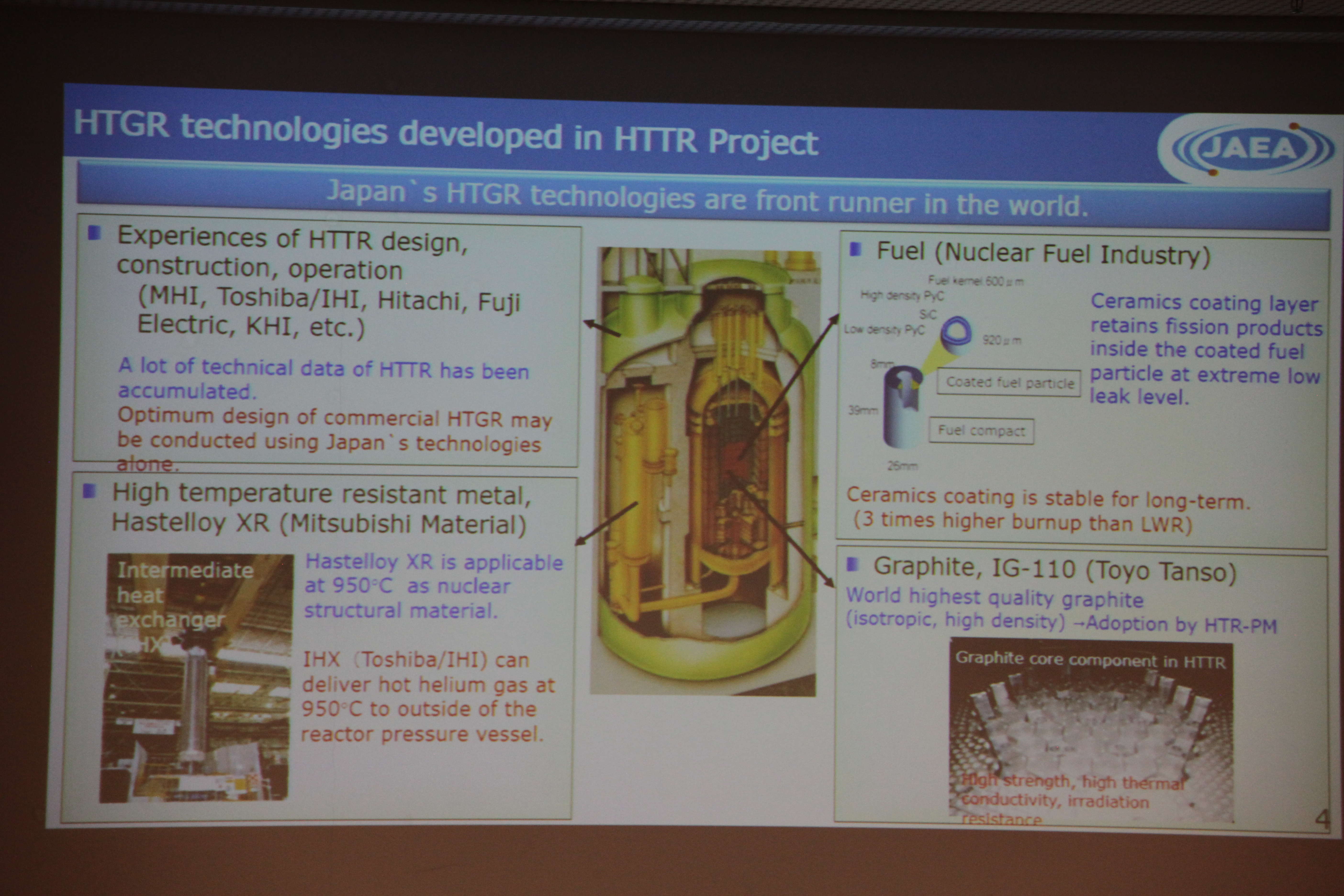 HTTR - на подходе к повторному пуску AtomInfo.Ru, ОПУБЛИКОВАНО 12.10.2019 В Вене в штаб-квартире МАГАТЭ с 16 по 20 сентября 2019 года прошла работа очередной, 63-ей по счёту сессии генеральной конференции атомного агентства. На полях сессии японская делегация провела семинар, посвящённый тематике высокотемпературных реакторов. В частности, в ходе семинара было рассмотрено текущее положение с японским исследовательским ВТГР HTTR. На семинаре, фото Игорь Балакин (AtomInfo.Ru) ![]() Реактор HTTR Реактор HTTR впервые достиг критики 11 октября 1998 года. Его тепловая мощность - 30 МВт(т). В качестве теплоносителя применяется гелий. Выходная температура теплоносителя, достигнутая на практике - 950°C. Замедлитель - графит. Топливо - шаровые твэлы, топливный материал - UO2. Обогащение по 235U составляет от 3% до 10%, среднее значение - 6%. Разработка проекта HTTR началась в 1969 году. К подготовке рабочей документации приступили в 1985 году, когда проект получил своё нынешнее название. Строительство велось в 1991-1997 годах, первая критика, как уже сказано, состоялась в 1998 году. Из других важных вех истории HTTR стоит отметить 2004 год, когда на реакторе была достигнута (впервые в мире) выходная температура теплоносителя 950°C. В 2007 году реактор отработал 30 суток с выходной температурой 850°C, а в 2010 году - 50 суток с выходной температурой 950°C. После аварии на Фукусиме реактор HTTR был остановлен, и началось его перелицензирование для соответствия постфукусимским стандартам в области безопасности. Щёлкните левой клавишей мыщи для просмотра ![]() Технологии, разработанные для проекта HTTR. ![]() Анализ безопасности HTTR На семинаре представители японской делегации перечислили основные вопросы, обсуждавшиеся с регуляторами. По сейсмостойкости регуляторы потребовали поднять проектное землетрясение с 350 гал до 973 гал. Также была проведена работа по переквалификации части конструкций и систем. Так, системе отвода тепла от активной зоны и внутрикорпусным конструкциям реактора был присвоен класс "B" вместо ранее присвоенного им класса "S". По завершению анализа сейсмостойкости HTTR было сделано заключение о том, что серьёзных мер по укреплению конструкций и систем не понадобится. Японская классификация зданий, конструкций и систем по сейсмостойкости. ![]() По угрозе цунами окончательный вывод благоприятиный. Максимально возможная высота цунами составляет 17,8 м, в то время как площадка HTTR расположена на отметке 36,5 м над уровнем моря. Таким образом, волны цунами реактору не опасны. Проект HTTR рассчитан на скорость ветра до 100 м/с. Защита от ветра такой силы в проекте адекватная, все системы и конструкции, которые требуется защищать, находятся внутри реакторного здания. По защите от извержений вулкана в проекте заложено следующее требование - толщина слоя пирокластического материала до 50 см. После внимательного рассмотрения проекта было решено организовать вокруг реактора огнезащитный пояс в качестве дополнительной меры защиты. Пожарная безопасность реактора в целом находится на должной высоте, количество горючих материалов в реакторном здании ограничено. Однако был поставлен вопрос о необходимости замены части кабелей на огнестойкие марки. Положительными оказались итоги рассмотрения возможных аварий с обесточиванием площадки. Было показано, что отвод остаточного энерговыделения от активной зоны будет осуществл
