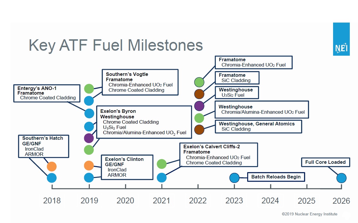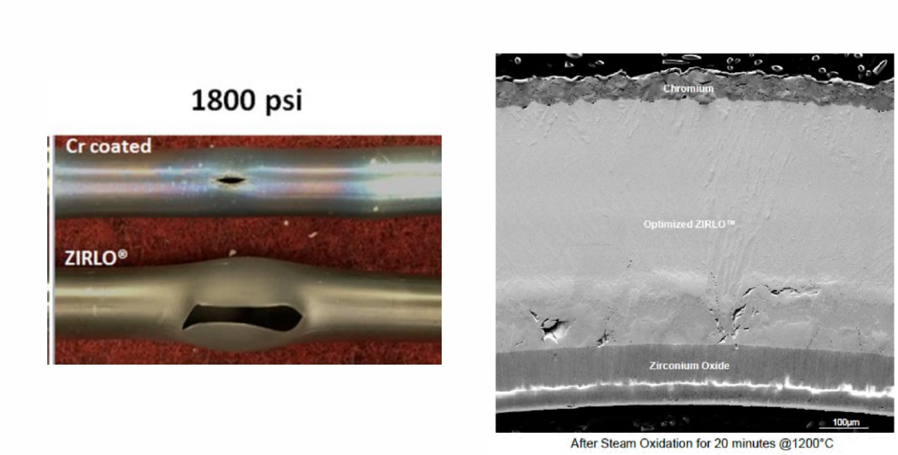 NRC готовится к лицензированию ATF с хромовым покрытием AtomInfo.Ru, ОПУБЛИКОВАНО 14.11.2019 Регуляторы США готовятся к внедрению одного из видов толерантного (ATF) топлива, а именно, топлива с хромированными оболочками. Лучший кандидат Покрытие оболочек твэлов из циркониевых сплавов тонким слоем хрома - один из простейших способов сделать топливо более устойчивым к аварийным ситуациям. Поэтому неудивительно, что поставщики топлива, работающие на американском рынке (в частности, "Framatome" и "Westinghouse"), уделяют хромированным оболочкам повышенное внимание в своих программах по ATF. Конечно, хром нельзя называть единственным кандидатом. Так, компания "Westinghouse" ещё относительно недавно рассматривала в качестве варианта покрытия карбид титана-алюминия Ti2AlC и даже проводила совместно с Массачусетским технологическим институтом реакторные испытания образца из сплава ZIRLO с таким покрытием. Но хром пока выигрывает у конкурентов. Считается, что именно хромовое покрытие лучше других умеет сохранять свои свойства как в нормальных условиях эксплуатации, так и при тяжёлых авариях, в том числе при LOCA. Если говорить об АЭС США, то первая полная загрузка активной зоны толерантным топливом будет с наибольшей вероятностью состоять именно из топлива с хромированными оболочками. И произойти это событие должно по планам довольно скоро - в 2026 году. Ключевые события для программы по ATF в США. ![]() Пример оболочек с хромовым покрытием от "Westinghouse". ![]() Подготовка регулаторов В сентябре 2018 года в комиссии по ядерному регулированию (NRC) США был принят план по подготовке регуляторов к будущему лицензированию толерантного топлива. Спустя месяц в институте EPRI был выполнен так называемый gap analysis, или анализ несоответствий для оболочек с покрытием. В январе 2019 года был выпущен первый отчёт по механизмам деградации и отказов оболочек с хромовым покрытием. А в апреле 2019 года была создана рабочая группа по методу PIRT (Phenomena Identification and Ranking Table, идентификация и ранжирование процессов и явлений), работа которой завершилась в июне 2019 года выпуском отчёта ML19172A154. До конца 2019 года NRC должна подготовить и утвердить по хромированным оболочкам документ под названием Interim Staff Guidance. В этом документе не будут вводиться новые требования или правила, его задача - указать техническому персоналу комиссии на важные для рассмотрения области, а подателям заявок на лицензии дать представление о том, с вопросами на какие темы они столкнутся при рассмотрении заявки. Среди всех видов ATF топливо с хромированными оболочками менее всего отстоит от топлива, применяющегося сегодня на атомных станциях. Действительно, речь идёт всего лишь о небольшом (не более 20 микрон) дополнительном слое у оболочки, для нанесения которого будут использоваться освоенные методики - например, холодное распыление (cold spray) или вакуумное напыление (physical vapor deposition). Однако технические эксперты NRC уже видят области, по которым к разработчикам топлива могут быть вопросы. Так, например, экспертов будут интересовать скорости окисления оболочек с покрытием, их наводораживание, а также поведение оболочек при высоких температурах. Кроме того, с добавкой покрытия появляются новые деградационные механизмы, отсутствующие у используемого сегодня топлива. Например, это образование трещин в покрытии или его расслоение. Также придётся рассмот