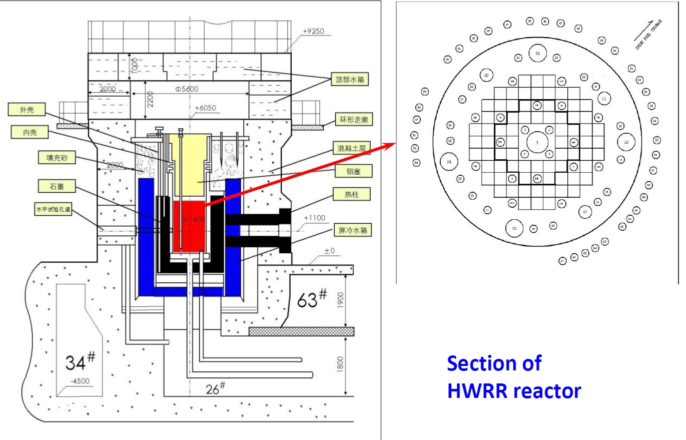 Модернизированный реактор После того, как пути двух стран на долгие десятилетия разошлись, реактор HWRR остался в ведении китайских атомщиков. Он прослужил свой первый срок до 1979 года и получил новую жизнь после модернизации, продлившейся до 1983 года. О том, как стал выглядеть реактор HWRR после модернизации, говорится в докладе на семинаре в Норвегии (2017 год), который сделал Чжоу Идун (Zhou Yidong) из китайского института атомной энергии. Градирня и здание реактора HWRR. ![]() Реакторный зал ![]() Реакторная установка и активная зона ![]() После модернизации активная зона реактора HWRR собирается из 72 кассет. В качестве топлива используется диоксид урана обогащением 3%. Шаг решётки - 9,2 см. Активная высота топлива - 100 см. В каждой топливной сборке содержится по 12 топливных стержней. Материал оболочки - сплав Zr-2. Поглощающий материал стержней СУЗ - кадмий. Предусмотрены стержни АЗ (2 штуки), компенсаторы (8 штук) и стержни АР (2 штуки). Тепловая мощность реактора - 15 МВт(т). Максимальный поток тепловых нейтронов - 2,6×1014 н/(см2с). Максимальный поток быстрых нейтронов - 1,4×1013 н/(см2с). Теплоноситель и замедлитель - тяжёлая вода. Отражатель состоит из тяжёлой воды и графита. Масса графита в отражателе - 26 тонн, в тепловой колонне - 12 тонн. Биологическая защита выполнена из бетона толщиной 2 метра, плотность бетона - 3,6 г/см3. Материал внутреннего корпуса реактора - алюминиевый сплав. Внешний корпус (кожух) выполнен из высокоуглеродистой стали. Для облучательных экспериментов и наработки изотопов имеются следующие возможности. Внутри внутреннего корпуса установлены 33 вертикальных канала, в графитовом отражателе - 34 вертикальных канала. Также имеются шесть горизонтальных нейтронных пучков и одна тепловая колонна. Конструкционный материал всех облучательных устройств - алюминиевый сплав. Основные отличия модернизированного реактора HWRR, получившего название HWRR-II, от исходного проекта таковы: - число сборок в активной зоне было уменьшено с 84 до 72; - шаг решётки был изменён с 13 см до 9,2 см; - материал топлива был изменён с металлического урана (обогащение 2%) на диоксид урана (обогащение 3%); - активная высота топлива была уменьшена с 124,3 см до 100 см; - материал оболочек был заменён с алюминиевого сплава на Zr-2; - расход теплоносителя в первом контуре был поднят с 400 м3/ч до 640 м3/ч; - расход рабочего тела во втором контуре был поднят с 1000 м3/ч до 1800 м3/ч; - изменены внутренний корпус реактора и два теплообменника. Области, по которым велись исследования как на исходном, так и на модернизированном реакторе, таковы: - ядерная физика; - физика реакторов и теплогидравлика; - защита и мониторинг реакторных параметров; - облучение материалов, включая ядерное топливо; - нейтронно-активационный анализ; - производство радиоизотопов; - технические услуги для АЭС; - эксплуатация реакторов; - подготовка персонала. Вывод из эксплуатации Благодаря модернизации, реактор HWRR смог дотянуть до почти 50-летнего срока службы. Его эксплуатационная лицензия подошла к концу 31 декабря 2007 года, и было решено далее её не продлевать. В этом сыграли роль как беспокойство за состояние стареющего оборудования, так и проведение в Пекине в 2008 году Олимпиады. Кроме того, в институте атомной энергии полным ходом шло строительство исследовательского реактора CARR мощностью 60 МВт(т), и ветеран HWRR был в итоге окончательно остановлен. 