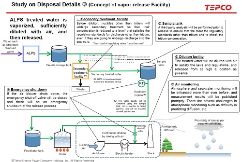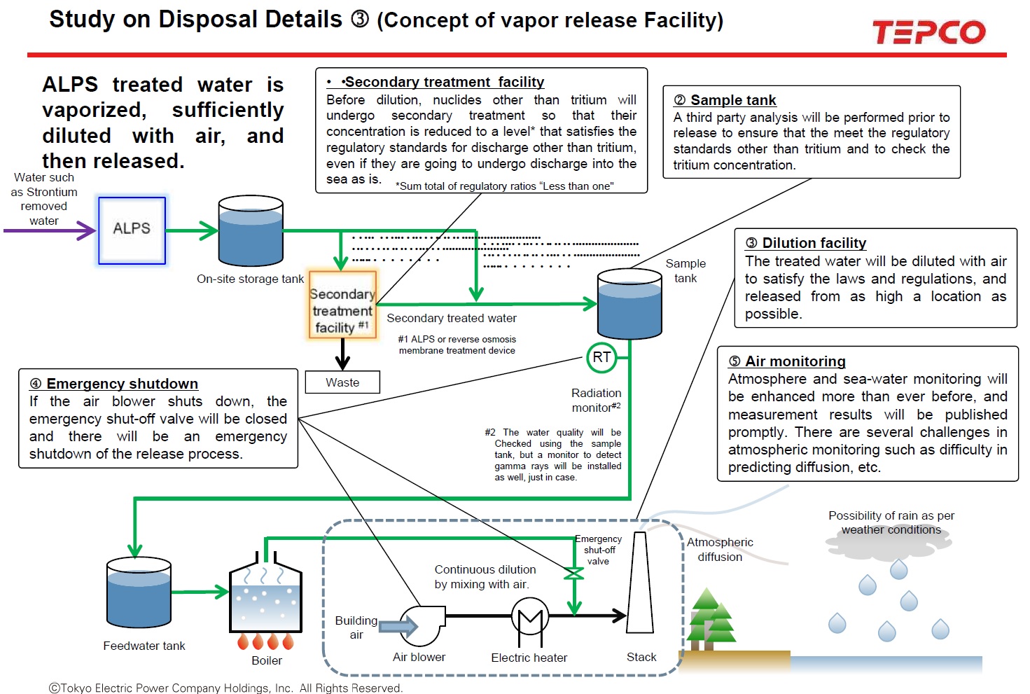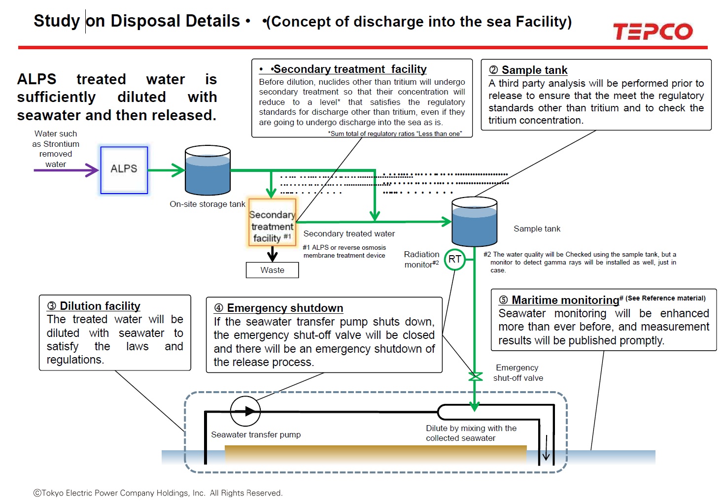 Воды Фукусимы - два сценария AtomInfo.Ru, ОПУБЛИКОВАНО 19.04.2020 Компания TEPCO опубликовала в марте 2020 года отчёт, в котором были рассмотрены два возможных сценария обращения с хранящейся на площадке аварийной АЭС "Фукусима Дайичи" (Япония) водой, загрязнённой по тритию. Запасы и сценарии По состоянию на 12 марта 2020 года, на площадке находилось 979 баков для хранения воды. Суммарный объём воды - около 1,19 миллиона кубометров. Средняя удельная активность трития в хранящейся воде - около 730 тысяч Бк/л. Общая активность по тритию в баках - порядка 860 триллионов беккерелей. В то же время, если перевести все запасы фукусимской воды в чистую тритиевую (супертяжёлую) воду 3H2O, то получится небольшая величина - всего порядка 16 грамм. Баки с водой на Фукусиме. ![]() Ранее в Японии были проанализированы пять возможных сценариев утилизации фукусимской воды. Три сценария, включая подземное захоронение, были отвергнуты и для дальнейшего рассмотрения остались только два варианта - сброс в море и выпаривание. Выпаривание В сценарии с выпариванием загрязнённая вода при необходимости сначала проходит через комплекс вторичной обработки (secondary treatment facility). Задача комплекса - снизить активности по другим изотопам, кроме трития, до разрешённых уровней для выбросов в атмосферу. После комплекса вторичной обработки вода поступает в бак для отбора проб (sample tank). Работой по отбору проб и контролем активности по всем изотопам, включая тритий, будет заниматься независимая от TEPCO компания. Дополнительный контроль осуществляется после бака для отбора проб средствами радмониторинга, контролирующими мощность дозы гамма-излучения. После радмониторинга вода поступает в подпиточный бак (feedwater tank), а далее - в бойлер. Из бойлера пары приходят в комплекс разбавления (dilution facility), где смешиваются с подающимся посредством газодувки нагретым атмосферным воздухом. Итоговая смесь подаётся в венттрубу и выпускается в атмосферу на как можно большей высоте. Ведётся контроль удельной активности в высвобождаемой в атмосферу смеси, также контролируется активность прибрежных вод. На границах площадки удельная активность трития в воздухе будет ниже предельно допустимого значения 5 Бк в 1 л атмосферного воздуха. На случай непредвиденных обстоятельств, в том числе, превышения заданного предела по тритию, в системе предусмотрены средства для немедленного (аварийного) останова. TEPCO отмечает, что компании потребуется время для совершенствования системы контроля за воздухом в том случае, если сценарий с выпариванием будет принят. Утилизация воды методом выпаривания. ![]() Сброс в море В сценарии с контролируемым сбросом фукусимской воды в море первая часть системы утилизации не отличается от варианта для сценария с выпариванием. Вода также проходит через комплекс вторичной обработки, бак для отбора проб и средства радмониторинга. После прохождения через средства радмониторинга вода поступает в комплекс разбавления, проходя по пути через задвижку системы аварийного останова. Комплекс разбавления в данном сценарии состоит из простейшего контура, в котором морская вода насосом подаётся на смешивание с поступающей в комплекс загрязнённой водой. Итоговая смесь сливается обратно в море. Для контроля за активностью сливаемой воды предусмотрена система мониторинга на базе уже имеющейся на площа