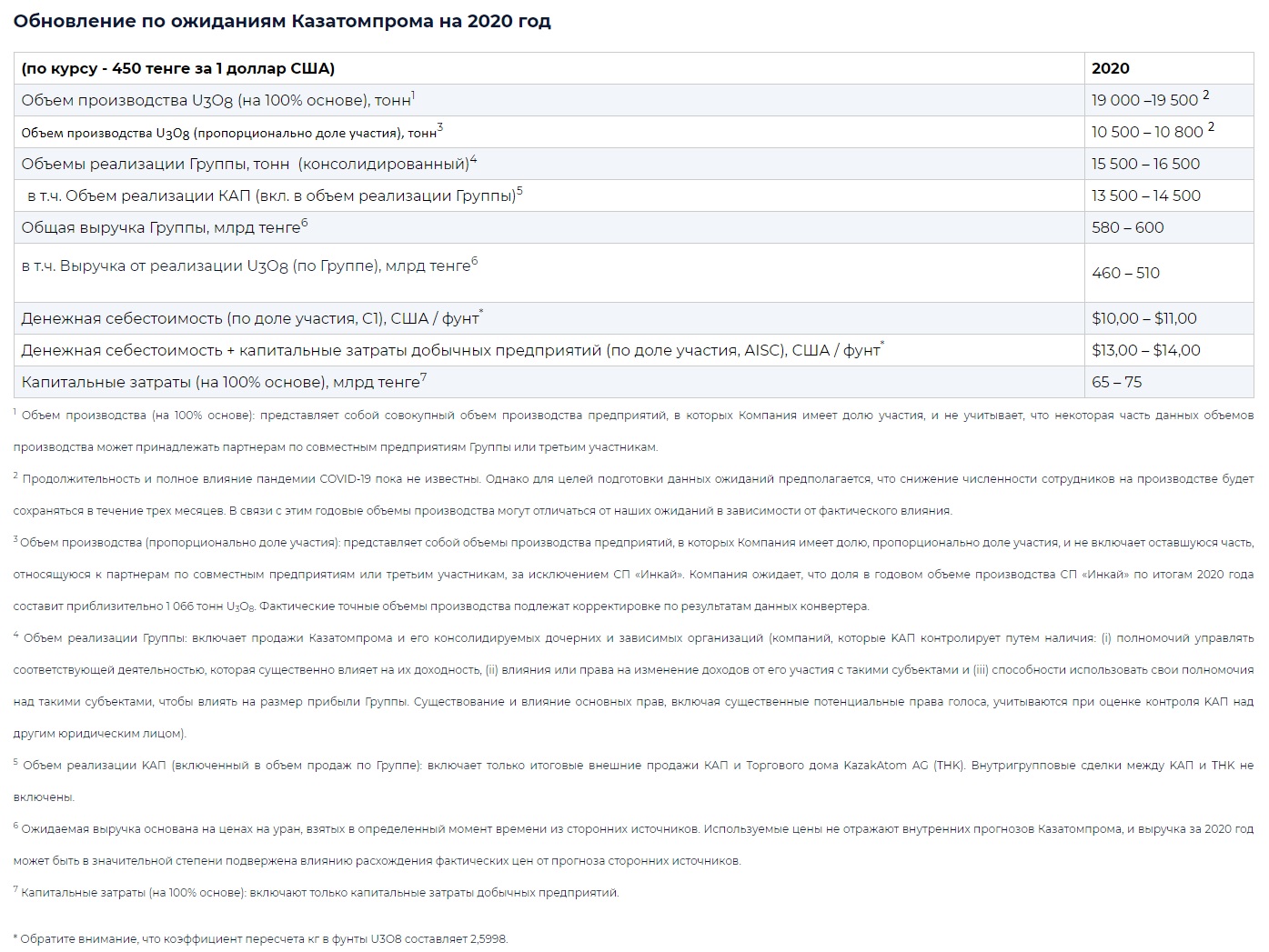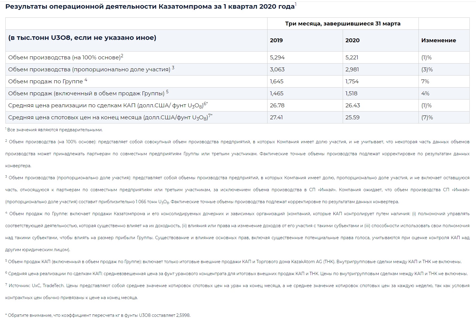 Казатомпром опубликовал результаты за I квартал 2020 года AtomInfo.Ru, ОПУБЛИКОВАНО 05.05.2020 "Казатомпром" опубликовал операционные результаты деятельности за 1 квартал 2020 года. Объём производства (на 100%-ной основе) в первом квартале 2020 года остался практически таким же, как в первом квартале 2019 года (снижение на 1%). В то же время объёмы продаж несколько выросли. Компания также обновила свои ожидания на 2020 год в целом. Результаты операционной деятельности Казатомпрома за 1 квартал 2020 года. ![]() Обновление по ожиданиям Казатомпрома на 2020 год. ![]() Ключевые слова: Уран, Азия, Казахстан Другие новости: Сроки сертифицирования в США АСММ NuScale сдвинуты из-за необходимости внести изменения в проект Система САОЗ может срабатывать с запаздыванием. Сроки строительства блоков №№3/4 АЭС "Vogtle" из-за коронавируса сдвинутся незначительно Пуск четвёртого блока сдвинут на два месяца. Госатомнадзор Белоруссии выдал разрешение на завоз ядерного топлива на БелАЭС Физпуск в июне или июле. |