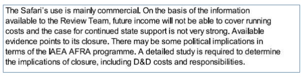 ЮАР - от Safari к MPR AtomInfo.Ru, ОПУБЛИКОВАНО 11.05.2020 Южная Африка вернулась к обсуждению идеи о строительстве многоцелевого исследовательского реактора MPR, призванного заменить со временем реактор "Safari-1". Знающие о сложных отношениях ЮАР и атома не удивятся тому факту, что разговоры о MPR начинаются не впервые. "Safari-1" Реактор "Safari-1" был построен в ЮАР при помощи Соединённых Штатов в рамках двухстороннего договора от 1957 года. Прототипом "Safari-1" послужил исследовательский реактор ORR в Окридже. "Safari-1" - это легководный аппарат типа tank-in-pool. Его проектная мощность составляет 30 МВт(т), но в реальности он эксплуатировался на мощности не более 20 МВт(т). Название реактора расшифровывается как "South African Fundamental Atomic Research Installation", однако полное имя употребляется крайне редко. Реактор находится в ядерном центре "Пелиндаба" в 40 км к юго-западу от Претории. Впервые он был выведен на критику 18 марта 1965 года. За свою историю реактор "Safari-1" переживал разные времена, но в последние годы старый аппарат оказался по-настоящему загружен работой. На одной из недавних конференций участники из ЮАР констатировали - "Safari-1" вошёл в тройку наиболее плотно используемых исследовательских реакторов в мире. Так было не всегда. В 90-ые годы атомная отрасль ЮАР переживала кризис, из 8 тысяч работников корпорации по атомной энергии (NECSA) буквально за пару лет осталось всего менее 2 тысяч. В 1996 году рабочая группа, созданная при профильном министерстве, постановила - реактор убыточен и имеющиеся факты свидетельствуют в пользу его закрытия. Заключение рабочей группы. ![]() Чтобы спасти реактор, южноафриканские атомщики в кратчайшие сроки освоили производство радиоизотопов. В частности, на базе "Safari-1" был создан один из ведущих мировых поставщиков молибдена-99, и, во многом благодаря этому, аппарат смог пережить отраслевой кризис. "Safari-2" Сроки службы "Safari-1" неоднократно продлевались, но продолжаться вечно такой процесс, естественно, не мог. Всерьёз о необходимости построить новый реактор на замену "Safari-1" заговорили в начале десятых годов. Корпорация NECSA была тогда настроена оптимистично и планировала пустить новый аппарат в 2020 году. Как легко убедиться, о пуске в 2020 году нет и речи, но, по крайней мере, идея о новом реакторе не забыта. Название нового реактора - MPR (multipurpose reactor). Неофициально его также именуют "Safari-2". Между прочим, это едва ли не единственная доступная информация о новом аппарате. NECSA хотела, чтобы новый реактор был многоцелевым. Но при этом атомщики выдвигали следующее условие: "Он не должен стать всем для всех!". Расшифровывалось это дополнение примерно так - нужен аппарат, подходящий под те задачи, которые интересны NECSA. Оставалось только понять, какие именно задачи ставила перед собой южноафриканская атомная компания, а вот с этим было сложнее. Ещё одна известная деталь - мощность MPR. Подход, которому следовала NECSA, был примерно такой - мощность нового реактора должна быть примерно такой же, как мощность старого. Если "Safari-1" работает на 20 МВт(т), то и MPR должен обладать мощностью 20 МВт(т), хотя при этом рассматривался и вариант с меньшей мощностью порядка 15 МВт(т). Интерес к проектированию и строительству нового исследовательского реактора в ЮАР проявляли различные компании. Если пролистать архивные новости, то можно обнаружить и свидетельства об интересе со стороны "Росатома". У атомной о