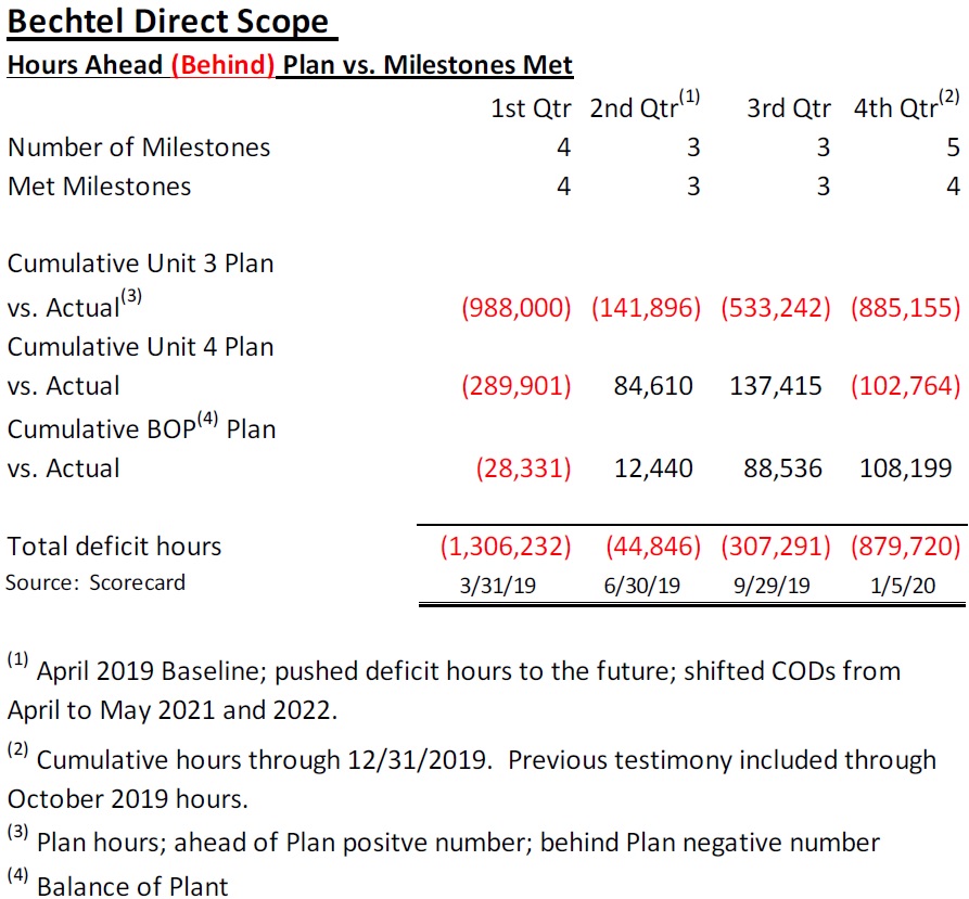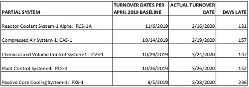 Вогл-3/4 - отчёт экспертов штата Джорджия AtomInfo.Ru, ОПУБЛИКОВАНО 12.06.2020 Комиссия по коммунальному хозяйству штата Джорджия (Georgia Public Service Commission) заслушала 5 июня 2020 года двух независимых экспертов, которые по поручению комиссии отслеживают ход строительства блоков №№3/4 АЭС "Vogtle" с реакторами AP-1000. Напомним, что это единственные строящиеся в данный момент в США атомные энергоблоки. В своём отчёте эксперты рассмотрели ход выполнения проекта в период с января по середину марта 2020 года. Последствия пандемии COVID-19 в отчёте не учитывались, так как она ещё продолжается, и оценить в полной мере её эффекты пока не представляется возможным. Текущее положение дел По состоянию на март 2020 года, степень готовности двух блоков составляла 85,7%. При этом практически полностью завершены работы по проектированию и инжинирингу (99,9%) и закупке оборудования (98,9%). Строительные работы завершены на 81,2% (зона ответственности "Bechtel" - 79,7%, зона ответственности субподрядчиков - 84,1%). Работы по АСУ ТП и кибербезопасности выполнены на 99,6%. Хуже всего (что очевидно) дело обстоит сейчас с исполнением программы по испытаниям оборудования - 20,4%. Это не должно вызывать удивления, потому что проект только вступает на данную стадию, завершающую перед пуском. За отчётный период (напомним, что речь идёт о периоде с января по середину марта) на строительстве был достигнут определённый прогресс. Однако, считают эксперты, наблюдается отставание от текущей версии графика, принятой в апреле 2019 года, в соответствии с которой сдача в коммерческую эксплуатацию блока №3 должна произойти 23 мая 2021 года. Эксперты привели несколько примеров в доказательство своих утверждений. Так, отстаёт от графика готовность систем и подсистем блоков. В феврале планировалось, что за апрель будут готовы 43 системы и подсистемы, по факту реально готовыми оказались только три системы. Готовность систем, требующихся для пролива на открытый реактор. ![]() Ключевые даты для блока №3, согласно текущему графику работ, таковы: - начало холодной обкатки - 31 мая 2020 года; - начало горячей обкатки - 26 июля 2020 года; - загрузка топлива - 23 ноября 2020 года; - ввод в коммерческую эксплуатацию - 23 мая 2021 года. Два принципа Компания "Georgia Power" придерживается двух основных принципов в ходе строительства блоков АЭС "Vogtle": - графики выполнения работ должны быть напряжёнными, что позволит создать запас по времени, необходимый для достижения поставленных целей по вводу блоков в эксплуатацию; - ошибаться лучше раньше. Иными словами, чем раньше будет выявлена та или иная проблема, тем больше времени окажется для её устранения. Эксперты в своём отчёте подвергли эти принципы критике и высказали мнение, что их применение на практике приводит к обратному результату, а именно, к задержкам в реализации проекта в целом. Напряжённый график фиксирует даты таких ключевых событий, как начало холодной и горячей обкаток и загрузка топлива. Для того, чтобы достичь их в установленный срок, подрядчики "должны сфокусировать усилия на узком объёме работ", ведущих к достижению указанных ключевых событий. В итоге работы по проекту выполняются кусками. Кабели прокладываются в индивидуальном порядке. Строительные работы часто прерываются и перенаправляются в интересах группы, отвечающей за испытания систем (initial test group, ITP), а ответственность за системы перекидыв