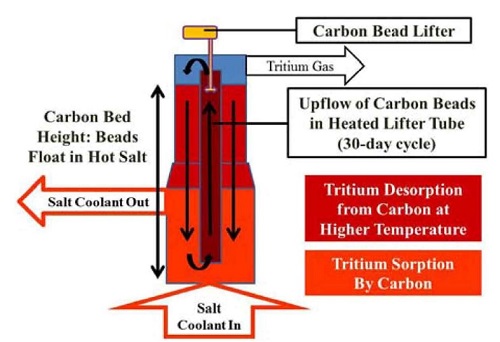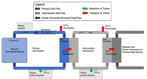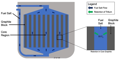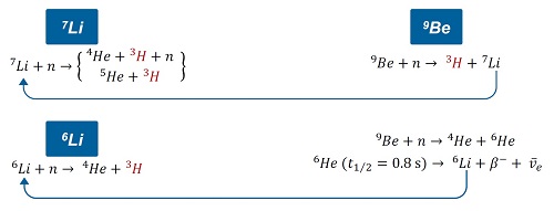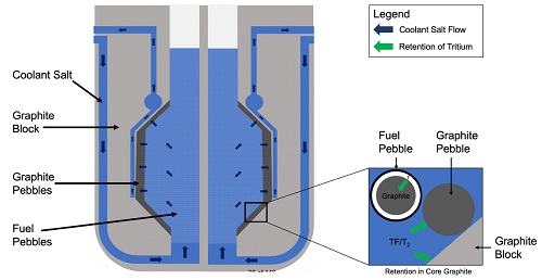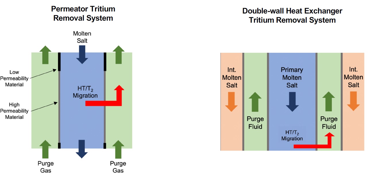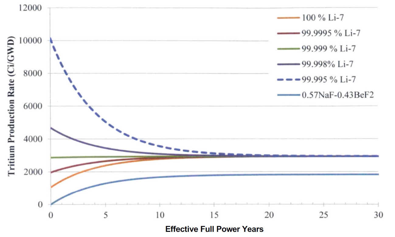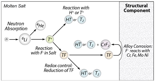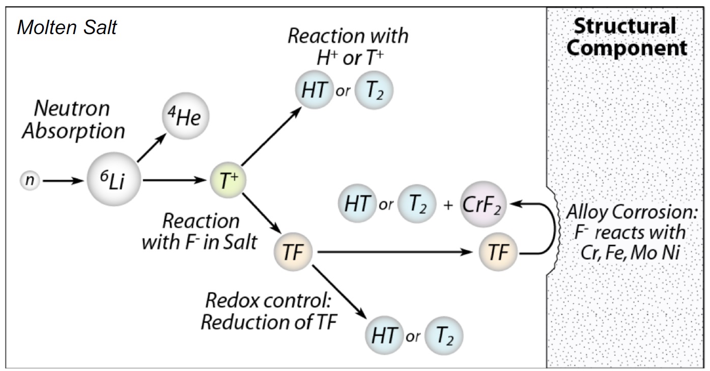 Тритий и ЖСР AtomInfo.Ru, ОПУБЛИКОВАНО 26.08.2020 Комиссия по ядерному регулированию (NRC) США провела 20 августа 2020 года очередные публичные слушания, посвящённые различным аспектам лицензирования перспективных реакторов. Одна из презентаций (авторы - Дэвид Грабаскас и др., Аргоннская национальная лаборатория) затронула проблему накопления, детектирования и контроля за тритием в жидкосолевых реакторах. Источники и опасность Тритий - радиоактивный изотоп водорода с периодом полураспада 12,3 лет. Он встречается в природе, где его источником служит взаимодействие космических лучей с атмосферой. Кроме того, тритий образуется в результате ядерных испытаний и работы ядерных реакторов. Тритий является низкоэнергетическим бета-эмиттером (максимальная энергия составляет порядка 18 кэВ). Его биологическая опасность связана, в основном, с внутренним облучением человека, так как энергии бета-частиц, образующихся при распаде трития, недостаточно для преодоления слоёв кожи. Изотоп встречается в природе в различных химических формах. В виде газа HT или T2 тритий попадает в организм при вдохе, но быстро покидает его при выдохе. В виде воды HTO тритий удаляется из организма в соответствии с биологическим полупериодом вывода воды (10 суток). А вот будучи в форме органически связанного трития (OBT), тритий ведёт себя в организме подобно углероду, и его биологический полупериод достигает 40 суток. Пути попадания трития в организм, иллюстрация CNSC. ![]() Литий и бериллий В ядерных реакторах тритий образуется в результате тройного деления (ядро раскалывается на три осколка, а не на два). Вероятность такого события - приблизительно 1 на 10 тысяч реакций деления. В легководных реакторах тритий в основном накапливается в топливе. Другие реакции, ведущие к образования трития, таковы. При захвате нейтрона на изотопе 10B может пройти реакция с выходом двух альфа-частиц и ядра трития. В тяжеловодных реакторах дополнительным источником трития служит захват нейтрона ядром дейтерия. ![]() Жидкосолевые реакторы отличаются от действующих легко- и тяжеловодных установок выбором теплоносителя и рабочих тел. Это приводит к тому, что в ЖСР появятся новые источники образования трития - литий и бериллий. Соли, предлагаемые для проектов ЖСР. ![]() Тритий может нарабатываться в результате захватов нейтронов на ядрах шестого и седьмого изотопов лития. У изотопа бериллий-9 есть реакция (n,T), а также реакция с расколом ядра на изотопы 4He и 6He, причём последний распадается с периодом менее секунды и переходит в литий-6, на котором, как уже сказано, может идти реакция с образованием трития. Реакции на литии и бериллии, приводящие к образованию трития. ![]() Природный литий состоит из 92,4% лития-7 и 7,6% лития-6. Скорость образования трития из 7Li меньше, чем из 6Li, поэтому для ЖСР целесообразно использовать обогащённый по седьмому изотопу литий. Типичное обогащение по 7Li составляет 99,995%, дальнейшая очистка от шестого изотопа может оказаться непосильно дорогой. Если в соли содержатся и литий, и бериллий, то изотоп литий-6 будет уничтожаться за счёт взаимодействия с нейтронами, а также образовываться из бериллия. Если в соли есть только бериллий, то в ней сначала будет происходить накопление лития-6, но в дальнейшем концентрация лития-6 придёт к равновесному значению. Сечения реакций с образованием трития. ![]() Скор