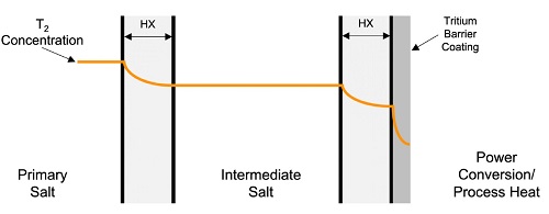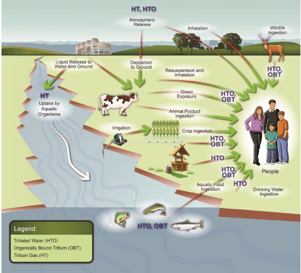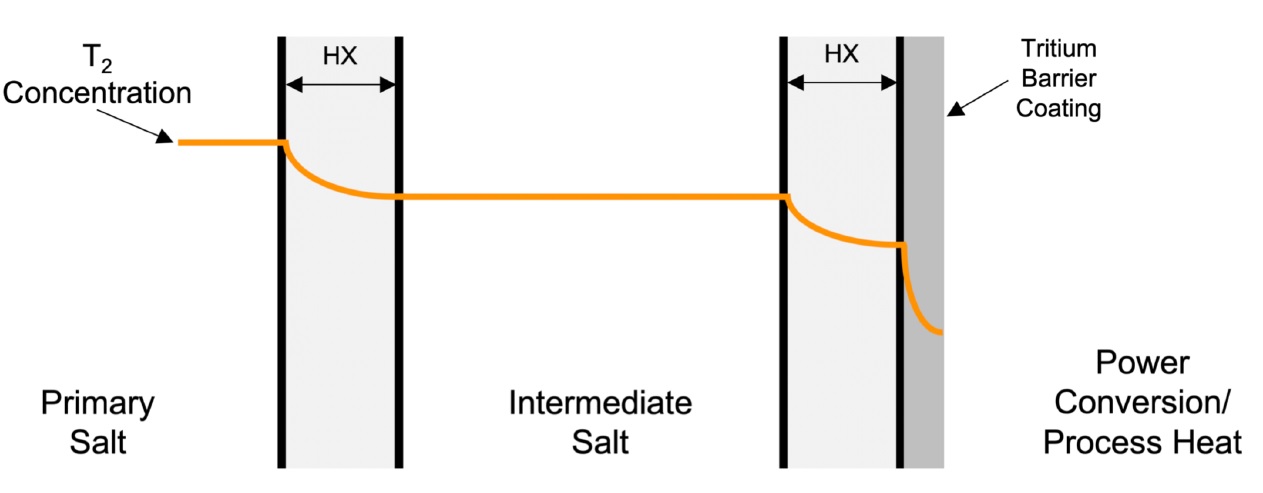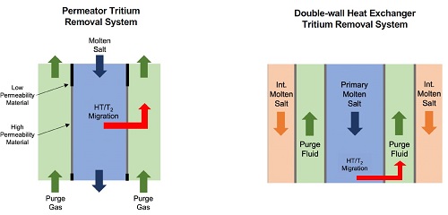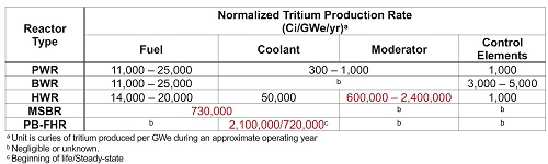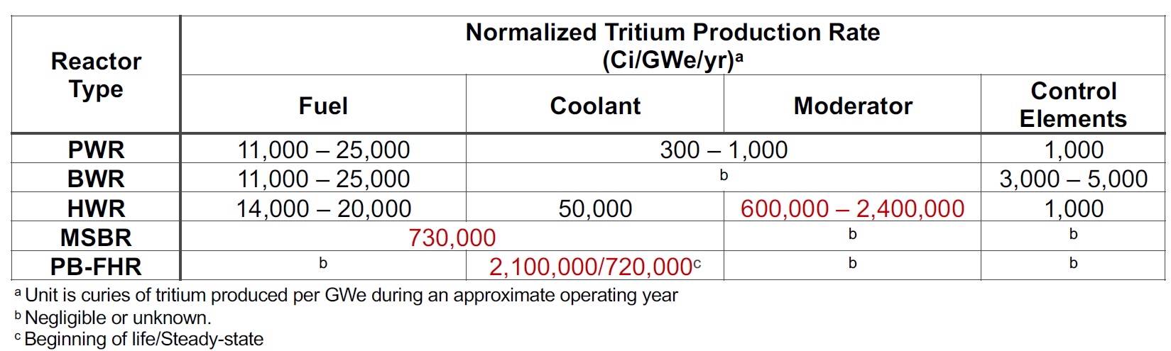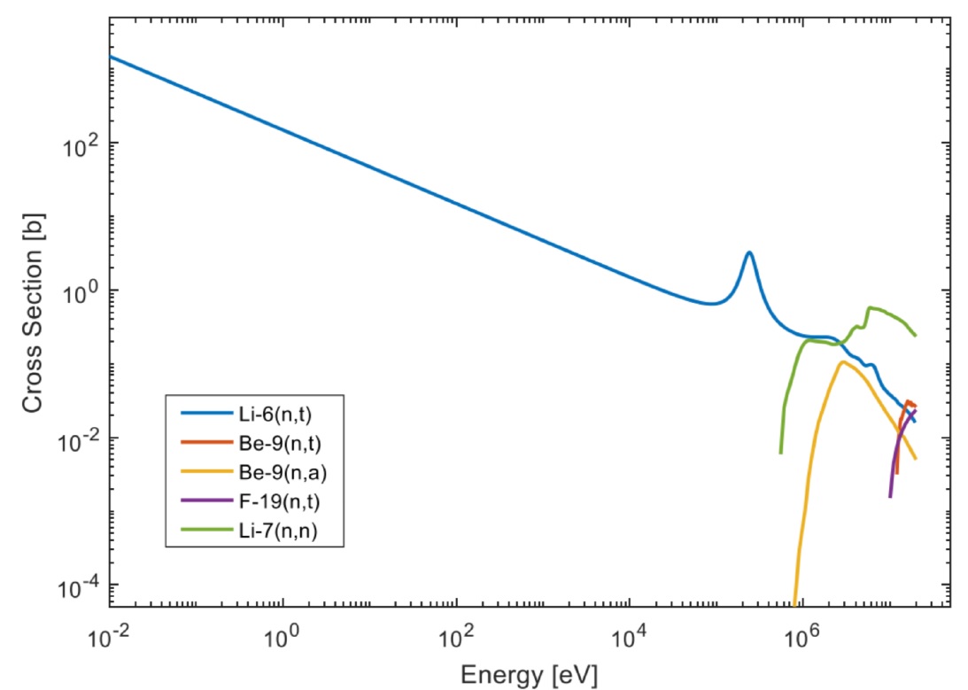 Тритий и ЖСР AtomInfo.Ru, ОПУБЛИКОВАНО 26.08.2020 Комиссия по ядерному регулированию (NRC) США провела 20 августа 2020 года очередные публичные слушания, посвящённые различным аспектам лицензирования перспективных реакторов. Одна из презентаций (авторы - Дэвид Грабаскас и др., Аргоннская национальная лаборатория) затронула проблему накопления, детектирования и контроля за тритием в жидкосолевых реакторах. Источники и опасность Тритий - радиоактивный изотоп водорода с периодом полураспада 12,3 лет. Он встречается в природе, где его источником служит взаимодействие космических лучей с атмосферой. Кроме того, тритий образуется в результате ядерных испытаний и работы ядерных реакторов. Тритий является низкоэнергетическим бета-эмиттером (максимальная энергия составляет порядка 18 кэВ). Его биологическая опасность связана, в основном, с внутренним облучением человека, так как энергии бета-частиц, образующихся при распаде трития, недостаточно для преодоления слоёв кожи. Изотоп встречается в природе в различных химических формах. В виде газа HT или T2 тритий попадает в организм при вдохе, но быстро покидает его при выдохе. В виде воды HTO тритий удаляется из организма в соответствии с биологическим полупериодом вывода воды (10 суток). А вот будучи в форме органически связанного трития (OBT), тритий ведёт себя в организме подобно углероду, и его биологический полупериод достигает 40 суток. Пути попадания трития в организм, иллюстрация CNSC. ![]() Литий и бериллий В ядерных реакторах тритий образуется в результате тройного деления (ядро раскалывается на три осколка, а не на два). Вероятность такого события - приблизительно 1 на 10 тысяч реакций деления. В легководных реакторах тритий в основном накапливается в топливе. Другие реакции, ведущие к образования трития, таковы. При захвате нейтрона на изотопе 10B может пройти реакция с выходом двух альфа-частиц и ядра трития. В тяжеловодных реакторах дополнительным источником трития служит захват нейтрона ядром дейтерия. ![]() Жидкосолевые реакторы отличаются от действующих легко- и тяжеловодных установок выбором теплоносителя и рабочих тел. Это приводит к тому, что в ЖСР появятся новые источники образования трития - литий и бериллий. Соли, предлагаемые для проектов ЖСР. ![]() Тритий может нарабатываться в результате захватов нейтронов на ядрах шестого и седьмого изотопов лития. У изотопа бериллий-9 есть реакция (n,T), а также реакция с расколом ядра на изотопы 4He и 6He, причём последний распадается с периодом менее секунды и переходит в литий-6, на котором, как уже сказано, может идти реакция с образованием трития. Реакции на литии и бериллии, приводящие к образованию трития. ![]() Природный литий состоит из 92,4% лития-7 и 7,6% лития-6. Скорость образования трития из 7Li меньше, чем из 6Li, поэтому для ЖСР целесообразно использовать обогащённый по седьмому изотопу литий. Типичное обогащение по 7Li составляет 99,995%, дальнейшая очистка от шестого изотопа может оказаться непосильно дорогой. Если в соли содержатся и литий, и бериллий, то изотоп литий-6 будет уничтожаться за счёт взаимодействия с нейтронами, а также образовываться из бериллия. Если в соли есть только бериллий, то в ней сначала будет происходить накопление лития-6, но в дальнейшем концентрация лития-6 придёт к равновесному значению. Сечения реакций с образованием трития. ![]() Скор