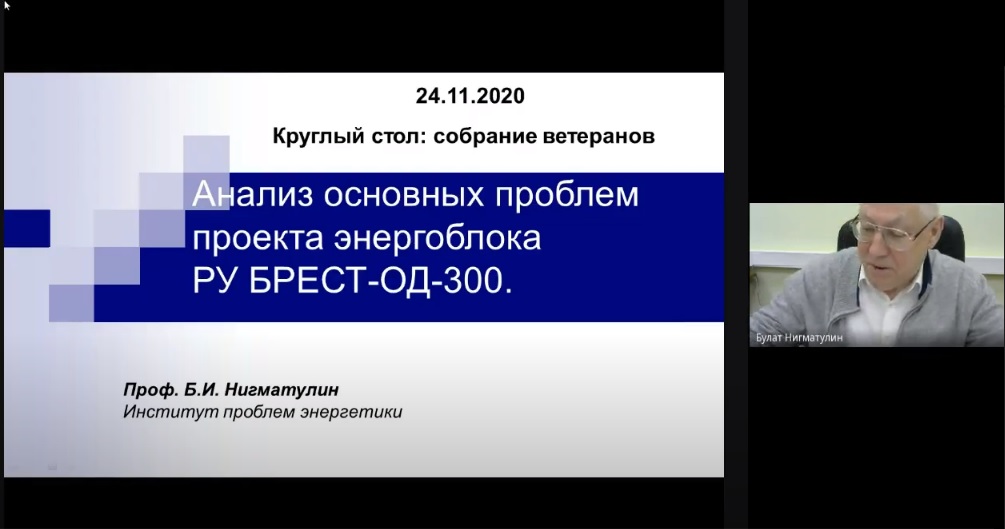 Ветераны МОДВ АЭП провели вебинар Оргкомитет научно-практического семинара экспертов Союза ветеранов наукограда МОДВ АЭП, ОПУБЛИКОВАНО 04.12.2020 Научно-практический семинар экспертов Союза ветеранов наукограда Межрегионального общественного движения ветеранов атомной энергетики и промышленности (МОДВ АЭП) состоялся в связи с проведением мероприятий в рамках 75-летия атомной энергетики. Семинар (вебинар в рамках online-конференции) организационно был реализован в форме отдельной секции международной научно-практической конференции Обнинского филиала МИФИ (ИАТЭ НИЯУ МИФИ) "Будущее атомной энергетики - atomfuture 2020", проводимой в ИАТЭ 23-24 ноября 2020 года. Тема ветеранской секции (семинара ветеранов): "Будущее ЯЭ. Какое будущее ждёт ЯЭ на базе создаваемых сегодня АЭС? (Опыт и знания ветеранов - молодому поколению)". В работе семинара приняли участие эксперты ядерной отрасли из научных организаций наукограда (г. Обнинска) и Москвы: ГНЦ РФ - ФЭИ, НИЦ КИ, ИАТЭ НИЯУ МИФИ, Технической академии Росатома, НПО "Тайфун", ядерной ассоциации ЦЯНТ и др. Секция состоялась 24 ноября 2020 года с 10:00 до 15:00. Вебинар был реализован на платформе GOOGLE MEET силами специалистов Обнинского филиала НИЯУ МИФИ. Для участия в семинаре необходимо было иметь аккаунт почты GMAIL. Актуальный код доступа к вебинару был выслан каждому заявившемуся участнику на его личную электронную почту. В программу вебинара входили следующие доклады.