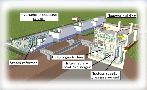 Максимально используя преимущества технологии легководных реакторов под давлением, конструкция "Mobile Small-PWR" обеспечивает стабильную работу даже в условиях качки, присущих морским операциям. Разработчики "Mobile Small-PWR" стремятся свести к минимуму потребности в ремонте и обслуживании, а также исключить необходимость частичных перегрузок (таковые могут потребоваться только для вариантов с работой реактора на одном и том же месте в течение длительного периода времени). ВТГР и водород Второе направление разработок в компании MHI, упомянутое в статье - высокотемпературные газоохлаждаемые реакторы. Направлением ВТГР в Японии занимается агентство по атомной энергии (JAEA). Есть практические результаты. Так, в 1998 году был впервые выведен на критику исследовательский реактор HTTR. Компания MHI с ранних стадий была активно вовлечена в работы по созданию HTTR. Во главе консорциума из четырёх компаний MHI отвечала за производство корпуса, оборудования и трубопроводов первого контура. В дальнейшем в сотрудничестве с JAEA компания занималась разработкой теплообменников, арматуры и иного оборудования для проекта газотурбинного высокотемпературного реактора GTHTR-300. Также в активе MHI есть разработки по связанным с ВТГР системам для производства водорода. Опираясь на накопленный опыт, в настоящее время компания MHI занимается разработкой когенерационной станции (реактор ВТГР и водородное производство). Щёлкните левой клавишей мыши для просмотра Температура теплоносителя на выходе из активной зоны составляет 950°C, что обеспечит условия для эффективного производства как электроэнергии, так и водорода. Проект станции предполагает работу в режиме маневрирования продукцией. Режим генерации электроэнергии - базовый. Сопряжённое водородное производство задействуется в тех ситуациях, когда потребление электроэнергии падает; это позволяет удерживать мощность реактора на одном и том же уровне. Высокая температура теплоносителя позволяет отказаться от паровой турбины. Теплоноситель (гелий) будет напрямую подаваться на гелиевую турбину. Для производства водорода на первом этапе предполагается задействовать технологию парового риформинга. Поставлена задача продемонстрировать преимущества когенерационных станций и осуществить на практике стабильное промышленное производство водорода за счёт энергии, вырабатываемой в ядерном реакторе. Конкретные показатели, приведенные в статье - 120 тысяч нормальных кубометров водорода в час, или более 900 миллионов нормальных кубометров водорода в год. Достигаться такие показатели должны за счёт отвода от реактора на водородное производство порядка 220 МВт(т). После 2050 года компания MHI предполагает перейти к другим методам производства водорода, таким как высокотемпературный электролиз пара или цикл йод-сера. С точки зрения экономической эффективности компания стремится достичь низкой себестоимости производства водорода и высокой эффективности производства электроэнергии. Для этого в реакторной части когенерационной станции будет проведена оптимизация с упрощением систем безопасности, что станет возможным за счёт внутренне присущих свойств безопасности высокотемпературного реактора. Также предполагается использование простых конфигураций - например, уже упомянутое решение о подаче гелиевого теплон