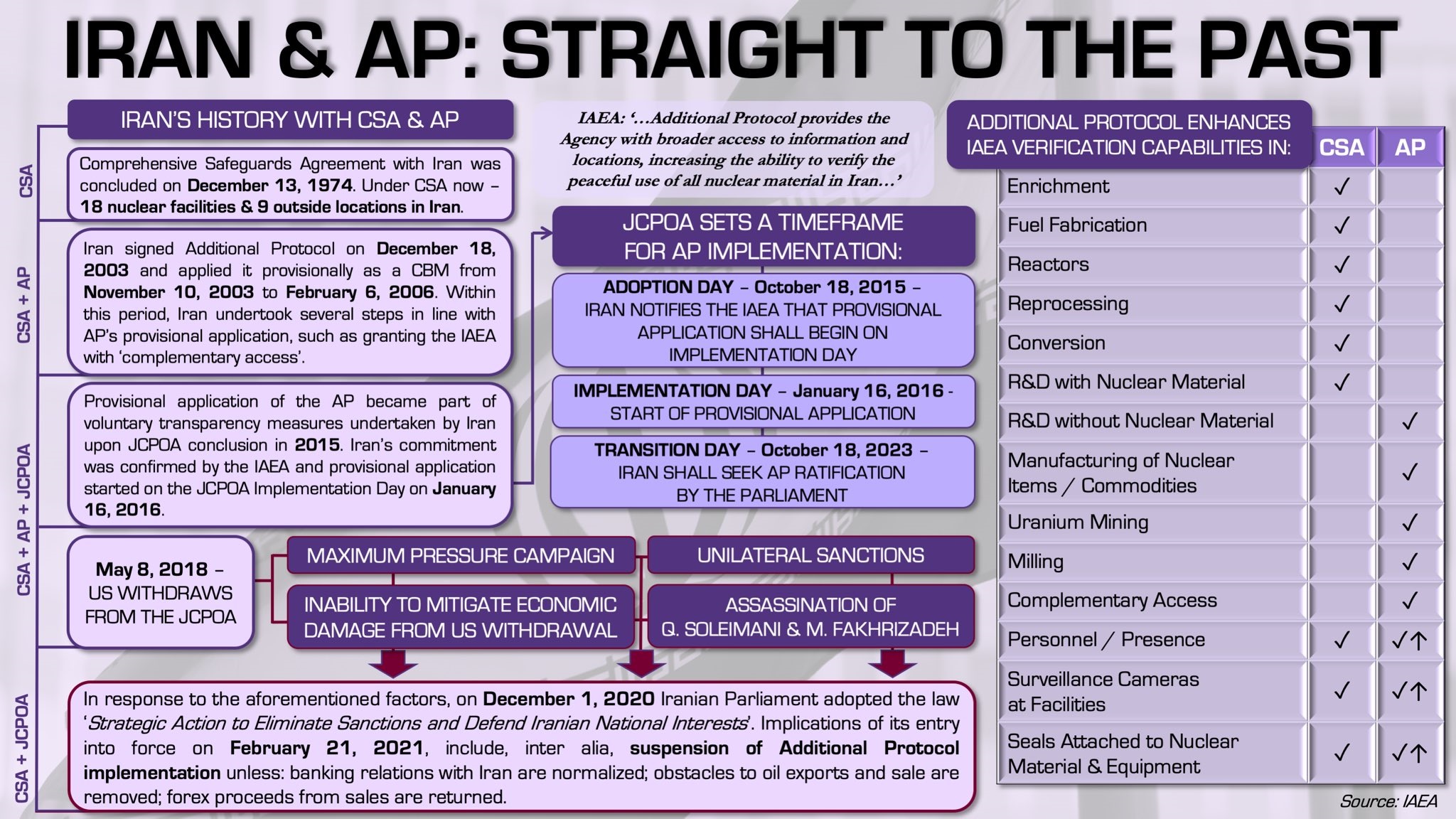Иран и доппротокол AtomInfo.Ru, ОПУБЛИКОВАНО 23.02.2021 Иран с сегодняшнего дня прекратил исполнять в добровольном порядке положения дополнительного протокола к соглашению о гарантиях в связи с ДНЯО. Полномочия инспекторов МАГАТЭ в этой стране в течение трёх ближайших месяцев будут определяться соглашением, достигнутым между Ираном и агентством в ходе срочного визита в Тегеран гендиректора МАГАТЭ Рафаэля Гросси. Система гарантий Основной международный договор, определяющий принципы использования атомной энергии - Договор о нераспространении ядерного оружия (ДНЯО), или "большая сделка". В соответствии с его условиями, пять стран из числа участников ДНЯО обладают ядерным оружием, остальные же государства от создания и владения ЯО отказываются. Взамен "неядерным" странам должно оказываться содействие в развитии мирных атомных технологий. Единственный полномочный международный орган, отслеживающий соблюдение странами условий ДНЯО - международное агентство по атомной энергии (МАГАТЭ), для чего в агентстве сформирована система гарантий, осуществляющаяся через юридически обязывающие соглашения МАГАТЭ и стран. Базовое соглашение для стран, не владеющих ядерным оружием - соглашение о всеобъемлющих гарантиях в связи с ДНЯО (comprehensive safeguards agreement, CSA). На сегодняшний день такое соглашение заключено со 175 странами. Опыт военной ядерной программы Ирака, существовавшей до войны в Персидском заливе 1990-1991 годов, продемонстрировал слабости и ограничения условий соглашений о гарантиях. Поэтому система гарантий была усилена дополнительным протоколом к соглашению о гарантиях (additional protocol), существенно расширившим как права инспекторов, так и объём проверяемой деятельности. Список подписавших и введших доппротокол в действие стран можно посмотреть на сайте МАГАТЭ. Основные различия между условиями соглашений о гарантиях и доппротокола показаны в таблице справа на инфографике, опубликованной в твиттере постпредства России при международных организациях в Вене. Щелкните левой клавишей мыши для просмотра ![]() Иранский случай Иран относится к разряду стран, имеющих действующее соглашение о гарантиях, а также подписавших, но не ратифицировавших (не введших в силу) доппротокол. Поэтому Иран обязан предоставлять МАГАТЭ условия для проверки ядерной деятельности в базовом объёме (соглашение о гарантиях), но не обязан - в расширенном объёме (доппротокол). Следовать доппротоколу Иран может сейчас только в добровольном порядке. Страна поступала так дважды - в 2003-2006 годах и начиная с января 2016 года по 23 февраля 2021 года. Причём во второй раз Иран принимал на себя добровольное обязательство следовать условиям доппротокола в соответствии с соглашением СВПД - ядерной сделкой между Ираном, пятёркой постоянных членов СБ ООН (они же ядерные державы в соответствии с ДНЯО) и примкнувшей к ним Германией. Как известно, при президенте Трампе Соединённые Штаты вышли из СВПД и ввели против Ирана целый ряд чувствительных экономических санкций, в том числе, угрожающих и компаниям из третьих стран, ведущих торговлю с Ираном. Попытки стран Евросоюза создать защитный механизм, который позволял бы европейским компаниям сотрудничать с Ираном не опасаясь американских санкций, не увенчались успехом. На этом фоне в декабре 2020 года парламент Ирана принял закон, обязывающий