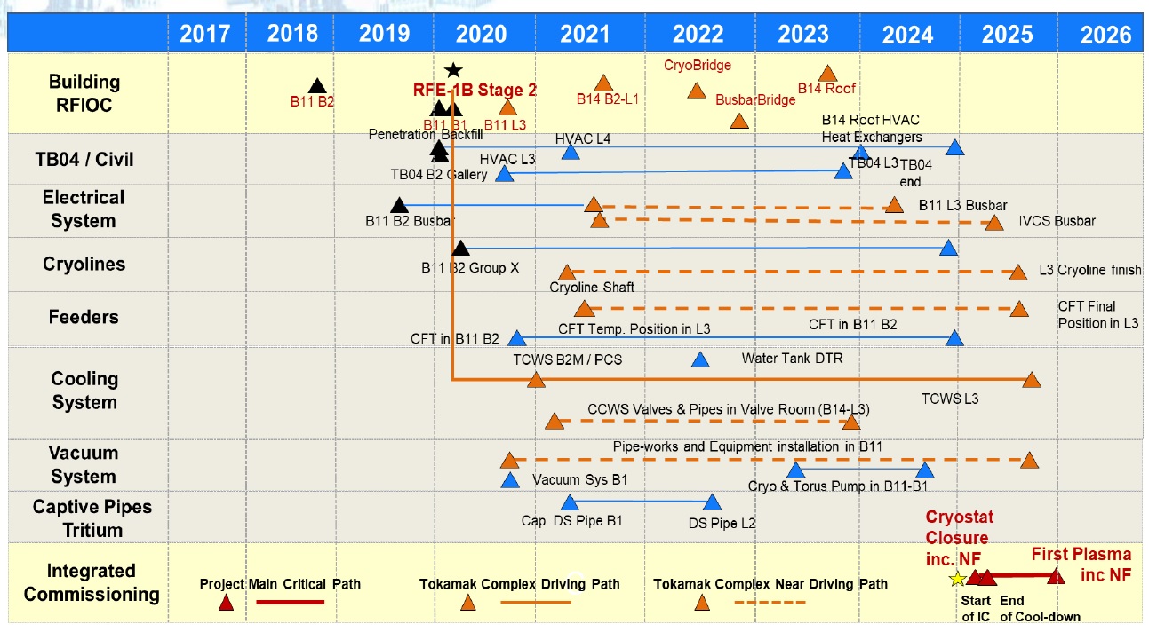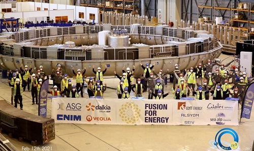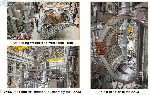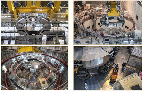 Бернар Биго о ходе работ на ITER AtomInfo.Ru, ОПУБЛИКОВАНО 15.06.2021 Традиционная конференция по термоядерной энергии прошла под эгидой МАГАТЭ в мае 2021 года. С докладом о текущем состоянии проекта по строительству экспериментального термоядерного реактора ITER выступил генеральный директор международной организации ITER Бернар Биго. Он сравнил текущее состояние с положением дел на момент предыдущей конференции, прошедшей в 2018 году. Изготовлены и смонтированы две из четырёх секций криостата - основание криостата (cryostat base) и нижний цилиндр (lower cylinder). Основание - самый тяжёлый узел реактора (1250 т, 30 м диаметр). Нижний цилиндр имеет в высоту 10 м, в диаметре 30 м. Основание было установлено в мае 2020 года, нижний цилиндр - в сентябре 2020 года. В последнем квартале 2020 года и первом квартале 2021 года выполнялись сварочные работы для соединения двух секций. Третья секция криостата (upper cylinder) изготовлена. Четвёртая (top lid) собирается на площадке. Монтаж основания криостата в мае 2020 года. ![]() Монтаж нижнего цилиндра криостата в сентябре 2020 года ![]() Сварочные работы на двух нижних секциях криостата ![]() Сектор №6 вакуумной камеры (vacuum vessel) был изготовлен в Южной Корее в 2020 году. В августе 2020 года он был доставлен на площадку в Кадараше, в сентябре того же года он прошёл гелиевый тест на целостность. В марте-апреле 2021 года сектор был установлен в сборочный стенд (sector sub-assembly tool, SSAT). Сектор №6 готов к отправке, июнь 2020 года ![]() Прибытие сектора №6 на площадку, август 2020 года ![]() Гелиевые испытания сектора, сентябрь 2020 года ![]() Установка сектора в SSAT, март-апрель 2021 года ![]() В период с апреля 2020 года по май 2021 года на площадку было поставлено семь катушек тороидального поля магнитной системы ITER. Завершена работа по подготовке к предварительной сборке катушек TF12 (поставлена в апреле 2020 года) и TF13 (поставлена в июле 2020 года). Завершены изготовление и холодные испытания двух катушек полоидального поля - PF5 и PF6. Холодные испытания катушки PF6, февраль 2021 года ![]() Бернар Биго в своём докладе назвал основные монтажные работы, завершённые внутри шахты реактора по состоянию на апрель 2021 года. На указанную дату были завершены работы по монтажу основания и нижнего цилиндра криостата, выполнены сварочные работы по соединению основания и нижнего цилиндра. Установлены трубы системы мониторинга потока нейтронов, тепловая защита нижнего цилиндра и опоры девяти тороидальных катушек. Кроме того, на временные опоры была установлена полоидальная катушка PF6. Монтаж катушки PF6, апрель 2021 года ![]() В следующей части своего доклада Бернар Биго остановился на состоянии работ по инфраструктуре площадки. Приступают к испытаниям оборудования на криокомбинате, завершаются работы по системе электроснабжения (в январе 2019 года было готово её соединение с электросетью Франции). По оборудованию, чьё изготовление продолжается, Биго отметил сектора вакуумной камеры. Седьмой сектор должен прибыть на площадку в ближайшее время, пятый сектор находится на финальной стадии изготовления (идёт сварка четырёх секций). Все оставшиеся сектора вакуумной камеры находятся на "продвинутой стадии производства", сказал Биго, но напомнил, что их поставка "находится на критическом пути для достижения первой плазмы в 2025 году". В заключение глава международной организации ITER продемонстрировал участникам конференции текущу