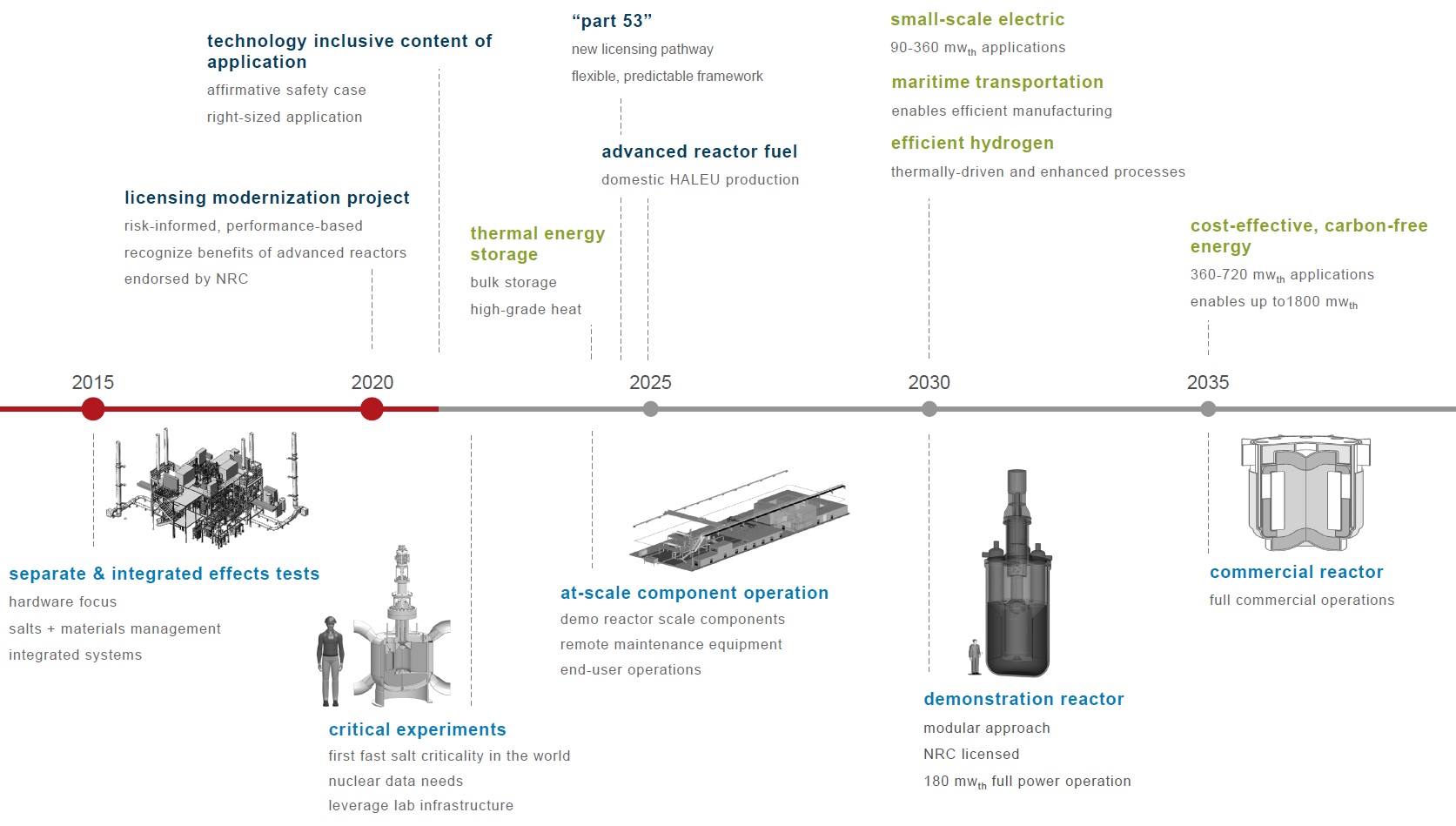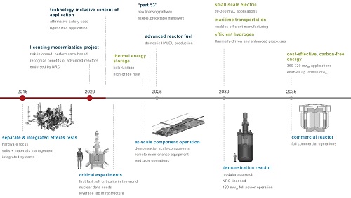 В итоге компания сделала выбор в пользу концепции быстрого ЖСР от "TerraPower". При этом компания признала наличие "пробелов" в концепции - в частности, большой перерыв в исследованиях жидкосолевых реакторов, ориентированные на LWR нормы и правила, необходимость в разработке нового топлива и нового реакторного оборудования. Устранить часть пробелов компания рассчитывает при помощи MCRE. Это исследовательский реактор, называемый также "критический эксперимент" (то есть, фактически критстенд нулевой или малой мощности), который должен быть построен при поддержке министерства энергетики на площадке нацлаборатории Айдахо. Стоимость проекта MCRE компания оценила как 113 миллионов долларов. Топливо - уран высокого обогащения, мощность "малая". Кроме подтверждения основных расчётных и конструкторских решений реактор (критстенд) MCRE должен будет продемонстрировать работу на протяжении пяти лет. После MCRE должен быть построен демонстрационный энергетический реактор под условным названием MCFR-D, и только после этого появятся серийные коммерческие реакторы MCFR-CR. Основные вехи программы по созданию быстрых ЖСР представлены на рисунке ниже. Критстенд MCRE должен быть построен в 20-ые годы, демонстрационный реактор MCFR-D мощностью 180 МВт(т) - в начале 30-ых годов, коммерческие MCFR-CR появятся после 2035 года. Щёлкните левой клавишей мыши для просмотра ![]() Компания привела в презентации некоторые параметры коммерческого MCFR-CR: