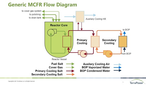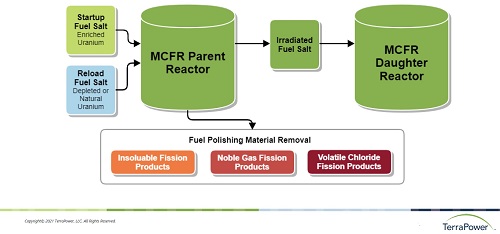 Проект получил поддержку министерства энергетики США посредством программы демонстрации перспективных реакторов (Advanced Reactor Demonstration Program, ARDP), в рамках которой на нужды проекта выделяется 170 миллионов долларов за срок пять лет. Разработки "TerraPower" Как видно из состава кооперации, основным разработчиком концепции быстрого жидкосолевого реактора на хлоридах является компания "TerraPower". Впервые об интересе компании "TerraPower" к жидкосолевому направлению электронное издание AtomInfo.Ru сообщило в ноябре 2015 года. В материалах, размещённых на сайте компании, указывается, что она сосредоточилась на разработке быстрого ЖСР, в противовес американским исследованиям 60-ых годов, которые были сконцентрированы на направлении тепловых ЖСР. Соответственно, это определило выбор в пользу хлоридов, а не фторидов. Конкретные составы солей на сайте "TerraPower" не называются. Известно, однако, что в интересах компании национальная лаборатория Айдахо выполняла работы по измерению теплофизических свойств соли NaCl-PuCl3. В 2016 году "TerraPower" получила от министерства энергетики пятилетний грант на 40 миллионов долларов, что позволило ей приступить к выполнению экспериментальных программ по тематике быстрого ЖСР (на сайте компании он именуется как MCFR). Презентация "Southern Nuclear" В мае 2021 года компания "Southern Nuclear" подготовила презентацию, в которой пояснила свой интерес к быстрым ЖСР и привела некоторые подробности о демонстрационных и коммерческих реакторах такого типа. Компания провела сравнительный анализ концепций реакторов IV поколения и поставила ЖСР наивысшую оценку. В анализе рассматривалось семь параметров: