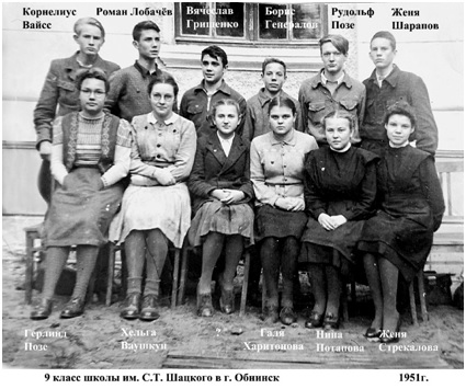 Юбилей первого послевоенного выпуска школы Шацкого Нинель Мурогов, ОПУБЛИКОВАНО 21.12.2021 Предисловие Уважаемая редакция и читатели издания AtomInfo.Ru, позвольте напомнить об юбилее. В этом уходящем 2021 году исполняется 70 лет первому послевоенному выпуску десятиклассников в Обнинске. Сейчас Обнинск - наукоград, 18 школ, университеты и научно-исследовательские институты и центры. А тогда - это был первый выпуск из четырёх учеников, первой средней школы-десятилетки в Обнинске. В следующем 2022 году будет юбилей выпуска десятиклассников 1952 года школы имени С.Т.Шацкого - первого международного выпуска с детьми немецких специалистов, работавших в ФЭИ. О событиях тех лет и их предистории - воспоминания десятиклассника первого выпуска 1951 года Мурогова Нинеля. Школа имени С.Т.Шацкого 70 лет назад, в 1951 году, в возрождённой школе им. С.Т.Шацкого состоялся первый послевоенный выпуск учеников, успешно окончивших школу. Школа стала десятилеткой. В то время она была первой и единственной школой на территории объекта. А начиналось всё в 1945 году, когда вернувшиеся из эвакуации Елизавета Алексеевна Шацкая (жена Теодора Шацкого) и её родная сестра Софья Алексеевна Польман возобновили учебные занятия для учеников младших классов. Занятия проводились в двух смежных помещениях, что позволяло одному преподавателю вести уроки одновременно в двух классах.Школьные помещения располагались в маленьком финском домике. Уроки вела, в основном, С.А.Польман. Слева - Елизавета Алексеевна Шацкая. ![]() К 1947 году количество учащихся выросло как за счёт детей специалистов, прибывавших на объект, так и за счёт детей из окружающих объект деревень (Пяткино, Доброе, Самсоново и др.). Слева - деревня Самсоново, 1950 год. ![]() Школа размещалась в одном, а с 1948 года в двух одноэтажных бревенчатых деревенских избах, сохранившихся ещё с довоенных времён и переживших оккупацию. Располагались школьные здания через дорогу, напротив северного крыла главного корпуса ФЭИ. Школа стала семилеткой. Её директором была назначена Е.А.Шацкая. Она же вела уроки математики и геометрии. Следует отметить, что проблемами школы активно занималось руководство объекта (инженер-полковник Пётр Иванович Захаров) и всячески поддерживало инициативы Е.А.Шацкой, неоднократно призывавшей учеников и учительский коллектив возродить былую славу школы, стать одной из лучших в области и Союзе. В 1949 году для школы было построено новое двухэтажное здание на проспекте Ленина, дом 10 с физкультурным залом и лабораториями. Школа им.С.Т.Шацкого. ![]() Выпускной вечер первого выпуска Через два года, в 1951 году, школа отмечала свой первый выпуск. Как уже сказано, она стала десятилеткой. Это событие было торжественно отмечено не только школьной общественностью, но руководителями ФЭИ и объекта. На выпускном вечере, который проходил в новом административном корпусе слева от входа в ФЭИ, кроме учеников и учителей присутствовали руководители института и объекта. Среди них был и Александр Ильич Лейпунский. Александр Ильич Лейпунский, ![]() Такое внимание к школе было характерно для того времени и тех руководителей объекта. Многие его научные сотрудники неоднократно приходили на встречи со школьниками, вели факультативные занятия. Так, тогда ещё начинающие молодые учёные, сотрудники ФЭИ Лев Николаевич Усачёв, Алексей Сельвестрович Ро
