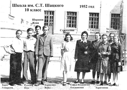 Первый выпуск Теперь о самих виновниках торжества, о первых выпускниках послевоенной школы им. С.Т.Шацкого. Их не много, всего четыре ученика: