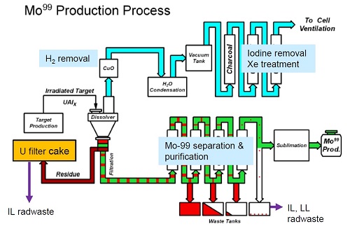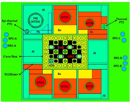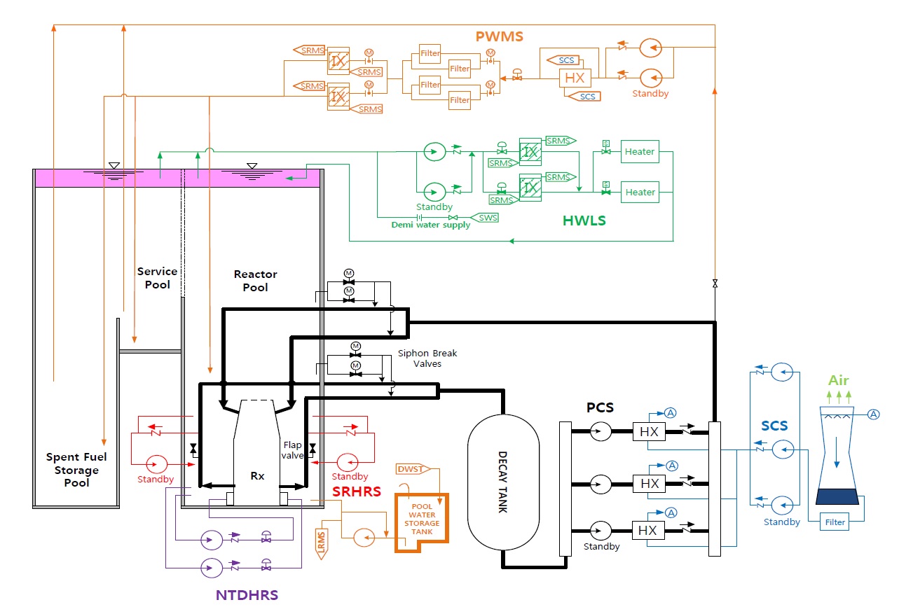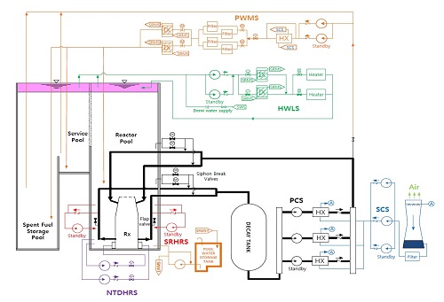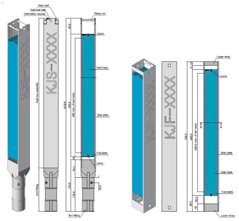 Топливо и активная зона Топливо KJRR представляет собой хорошо известную пластинчатую конструкцию. Каждая топливная сборка состоит из 21 пластины. Имеются два типа сборок унифицированного размера - штатная (SFA) и вспомогательная (FFA). Активная высота ТВС - 60 см. При разработке проекта ТВС за основу были взяты соображения из технического документа МАГАТЭ. Штатная (слева) и вспомогательная ТВС. ![]() Топливный материал представляет собой гомогенную смесь частиц уран-молибдена в алюминиевой матрице U-7Mo/Al-5Si. Добавка 5% кремния нужна для сдерживания химических реакций уран-молибдена с алюминием. Плотность уран-молибденового соединения составляет 8,0 г/см3. В стартовой загрузке у двух крайних пластин в каждой ТВС плотность ниже, 6,5 г/см3. За счёт высокой плотности и обогащения по урану-235 до 19,75% топливо может работать до выгорания 65%. Программу квалификации топлива проводили на исследовательских реакторах в Южной Корее и США (на реакторе ATR). Активная зона реактора KJRR собирается из 16 стандартных и шести вспомогательных ТВС. Предусмотрены позиции для размещения облучаемых образцов и мишеней, в том числе шесть позиций для размещения мишеней для наработки молибдена-99. Для управления реактивностью предусмотрены четыре регулятора и две сборки АЗ (эти системы независимы друг от друга). Поглотитель - гафний. Активная зона и экспериментальные устройства. ![]() Система охлаждения реактора Система охлаждения реактора KJRR двухконтурная. В первом контуре PCS (primary cooling system) циркулирует деминерализованная лёгкая вода, с его помощью отводится тепло от ТВС, облучательных устройств, отражателей и т.д. В первом контуре имеются три параллельно работающих насоса, каждый из которых способен обеспечить отвод 50% мощности реактора, и, соответственно, три теплообменника со вторым контуром. В работе постоянно находятся две петли, третья резервная. Второй контур SCS (Secondary Cooling System) отводит тепло в атмосферу посредством градирни. Имеется также система PWMS (Pool Water Management System), её задача отводить тепло от бассейнов - реакторного бассейна и бассейна выдержки облучённого топлива. Для аварийного отвода остаточного тепловыделения предусмотрена система SRHRS (Safety Residual Heat Removal System). Отдельный контур пришлось ввести для работ по ядерному легированию. Название системы - NTDHRS (Neutron Transmutation Doping Hydraulic Rotation System). Её задача - обеспечивать расход воды для вращения облучаемой заготовки кремния. Попутно она также берёт на себя часть функций по охлаждению отражателя. Система HWLS (Hot water Layer System) формирует слой горячей воды в верхней части реакторного бассейна и вспомогательного бассейна (между реакторным бассейном и бассейном выдержки). Это нужно для снижения мощностей доз рядом с верхом бассейнов в ходе нормальной эксплуатации. Также у системы есть функции по очистке воды от примесей (продукты коррозии, осколки деления и другие радиоактивные материалы). Щёлкните левой клавишей мыши для просмотра. ![]() Наработка молибдена-99 Важная, если не важнейшая функция KJRR - наработка молибдена-99. Проектная производительность реактора составит не менее 100 тысяч Ки/год, или не менее 2 тысяч Ки/неделя. Считается, что такие объёмы производства покроют все потребности Южной Кореи в молибдене-99. Наработка молибдена будет вестись в уран-алюминиевых мишенях, обогащение урана - НОУ, то есть менее 20%. Как легко понять, это оск