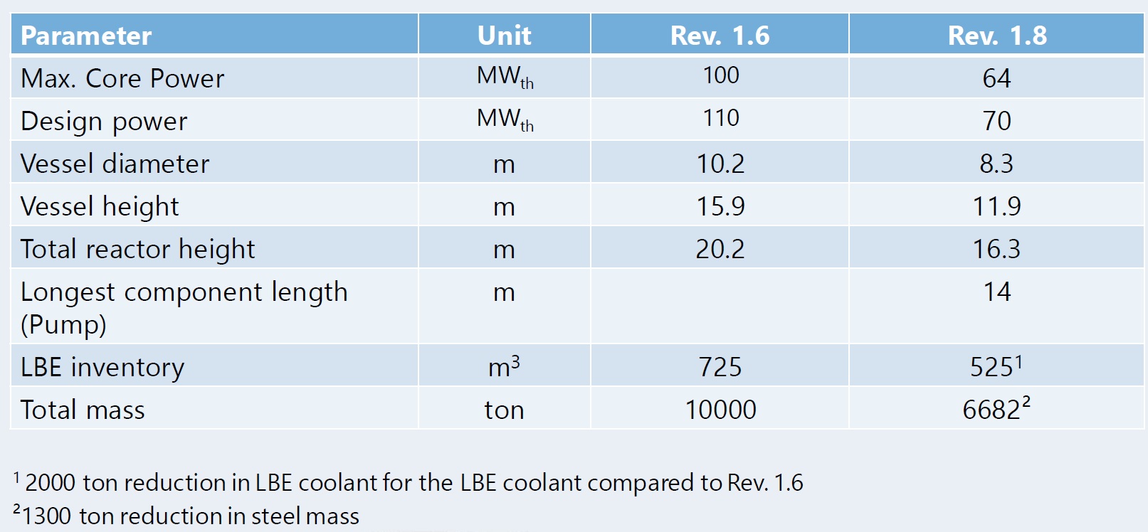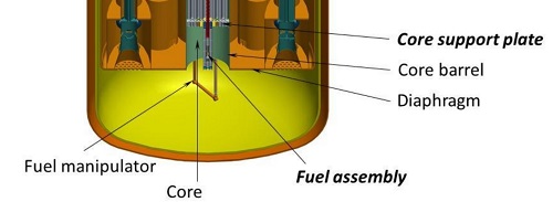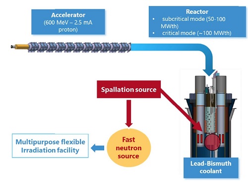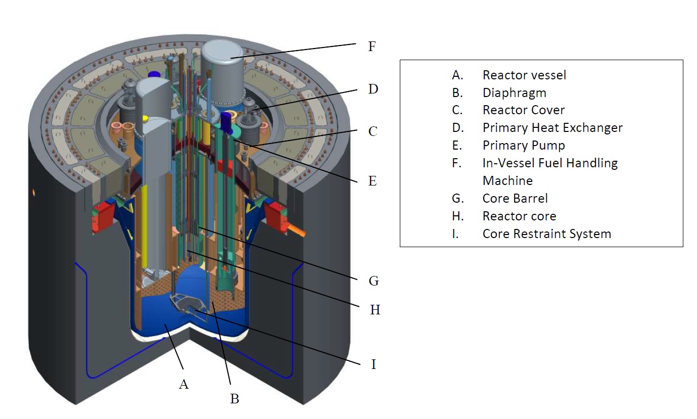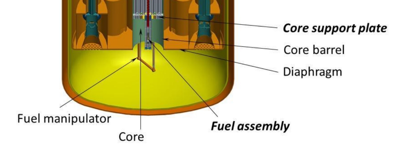 MYRRHA - текущее состояние AtomInfo.Ru, ОПУБЛИКОВАНО 08.05.2022 Международная конференция FR22 по быстрым реакторам и связанным с ними топливным циклам прошла в штаб-квартире МАГАТЭ в Вене с 19 по 22 апреля 2022 года. С докладом о текущем состоянии проекта MYRRHA выступил Дидье де Брюйн (Didier De Bruyn), представляющий бельгийский центр SCK-CEN. В начале выступления он уточнил, что в настоящее время вышел на пенсию. Планы по проекту Конечной целью бельгийского проекта MYRRHA является создание ADS-системы - подкритического реактора, управляемого ускорителем, и получение опыта её эксплуатации, который станет полезным для будущей демонстрационной установки (докладчик назвал это как "pre-industrial scale"). Проект развивается неторопливо и разбит на три этапа. Завершение первого этапа намечено на 2026 год, итогом станет ввод линейного ускорителя протонов на 100 МэВ. Второй этап (до 2032 года) знаменуется ускорителем на 600 МэВ, третий (до 2036 года) станет окончанием сборки системы и появлением в ней подкритического реактора с теплоносителем свинец-висмут (реактор также может работать в критическом режиме). Примерная схема MYRRHA после окончания третьего этапа. ![]() Правительство Бельгии поддерживает трёхэтапную реализацию проекта. Соответствующее решение было принято в 2018 году и подтверждено 23 июля 2021 года. Из госбюджета в срок до 2038 года предполагается выделить 558 миллионов евро. 17 сентября 2021 года была создана международная некоммерческая организация MYRRHA AISBL. Это самостоятельное юридическое лицо, в чью задачу входит поиск и привлечение внешних партнёров и инвесторов для проекта MYRRHA. Реактор версия 1.8 Далее докладчик остановился на текущем состоянии проекта свинцово-висмутового реактора, который входит в состав MYRRHA. В конце 2020 года была принята и заморожена версия 1.8 проекта реактора. Основные параметры во многом схожи с параметрами из версии 1.7. Прямо скажем, что по мощности, размерам корпуса и массе теплоносителя различия вообще отсутствуют. Докладчик, кстати, сравнивал версию 1.8 с версией 1.6. Основные различия между версиями 1.6 и 1.8. ![]() Реактор MYRRHA бассейнового типа тепловой мощностью 64 МВт(т). Генерация электроэнергии не предполагается. Топливо - MOX с содержанием плутония 30-35% весовых. Тепловыделяющие сборки шестигранные, дистанционирование твэлов за счёт навитой проволоки. Всего в активной зоне предусмотрено 211 позиций. Из них 55 позиций доступны сверху и предназначаются для органов СУЗ, инструментальных кассет и установки источника нейтронов при работе реактора в подкритическом состоянии. Эти позиции называются "многофункциональные каналы" (Multifunctional Channels). Загрузка ТВС и сборок отражателя производится снизу активной зоны, так как оборудование в верхней части реактора не позволяет организовать загрузку топлива обычным образом (сверху реактора). Благодаря плавучести (!!), сборки надёжно фиксируются под опорной плитой (core support plate). Также предусмотрена система, фиксирующая радиальные позиции сборок. Перегрузку осуществляют с помощью двух внутрикорпусных перегрузмашин (in-vessel fuel-handling machines), каждая из которых обслуживает свою половину активной зоны и свою половину позиций во внутрикорпусном бассейне выдержки. Щёлкните левой клавишей мыши для просмотра ![]() Компоновка реакторной установки интегральная, всё основное оборудование первого контура находится внутри корпуса реактора, 