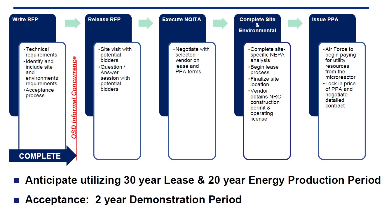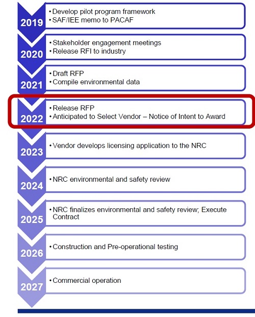 Минобороны США поддерживает программу следующим образом. Будет заключено соглашение о покупке электроэнергии и тепла от микрореактора сроком на 30 лет. При этом военные не собираются (!!) приобретать сам микрореактор; соответственно, и заявку на лицензирование в NRC будет подавать поставщик микрореактора. Площадкой для размещения демонстрационного микрореактора выбрана военно-воздушная база "Эйлсон" (Eielson) на Аляске. Выбор обусловлен соображениями "критичности миссии" и "возможностью снизить выбросы углерода". Текущее состояние В настоящее время ведётся организационная и бюрократическая подготовка проекта. Так, готовится юридически выверенное соглашение о закупках продукции (э/э и тепло) микрореактора. Заключено соглашение между военными ведомствами, министерством энергетики и NRC о техническом сотрудничестве, причём NRC будет сертифицировать проект как независимый регулятор. Со своей стороны, штат Аляска убрал в законодательном порядке микрореакторы из-под особой разрешительной процедуры, требовавшей для размещения реакторов согласия от парламента штата и одобрения от межведомственной комиссии в составе шести ведомств. Соответствующий закон №177 был принят в мае 2022 года 16 голосами "за" при двух голосах "против". На иллюстрации ниже приведены основные этапы подготовки и исполнения соглашения о покупке продукции микрореактора (Power Purchase Agreement, PPA). Щёлкните левой клавишей мыши для просмотра ![]() Далее докладчик рассказал о взаимодействии с общественностью и другими заинтересованными сторонами. В частности, начиная с ноября 2021 года поддерживаются контакты с вождями индейских племён, мэрами и сенаторами штата, а также с департаментом Аляски по сохранению природы. Создана рабочая группа Аляски по атомной энергии, раз в квартал выпускается специализированная газета. В планах стоит проведение т.н. предварительной конференции по "Эйлсону". На неё будут приглашены как представители военных и атомных ведомств США, так и представители разработчиков технологий микрореакторов. В ходе конференции предполагается осмотреть кандидатные площадки для размещения демонстрационного микрореактора, а также дать ответы на те вопросы, которые могут возникнуть у разработчиков. Планы на будущее В завершение презентации докладчик показал дорожную карту проекта. Она весьма и весьма напряжённая. Так, тендер в виде публикации запроса о предоставлении предложений (RFP) будет объявлен в этом году и в этом же году планируется выбор поставщика. Процесс лицензирования в NRC должен начаться в 2023 году. В 2025 году будет подписан контракт, строительство планируется на 2026-2027 годы. Соответственно, в 2027 году демонстрационный микрореактор должен приступить к работе. Дорожная карта. ![]() Ключевые слова: Малая энергетика, Микрореакторы, Военный атом, США, Статьи Другие новости: Первый бетон залит на энергоблоке №4 АЭС "Сюйдапу" в Китае Ввод блоков №№3/4 в эксплуатацию намечен на 2027-2028 годы. В Обнинске обсудят решения актуальных научно-технических задач в области физики ядерных установок "Нейтроника-2022" пройдёт с 31 мая по 3 июня 2022 года в Обнинске. Пусковой блок "Hongyanhe-6" (Китай) подключён к сети На блоке установлен реактор ACPR-1000. |