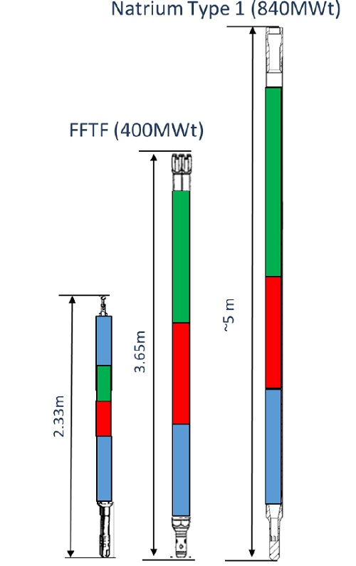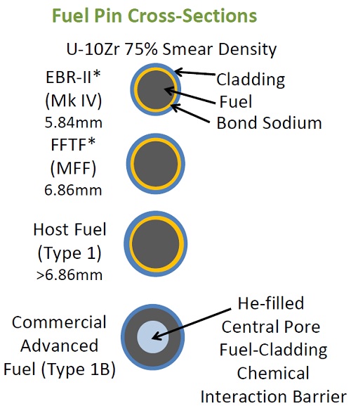 TerraPower о топливе для Natrium AtomInfo.Ru, ОПУБЛИКОВАНО 09.12.2022 Компания "TerraPower" на семинаре, организованном комиссией по ядерному регулированию (NRC) США, представила короткий доклад по теме разработки топлива для быстрого натриевого реактора "Natrium". Твэл и ТВС В проекте "Natrium" используется металлическое топливо - урановое, циркониевая (10%) матрица, 75% от теоретической плотности, с натриевым подслоем. Докладчик напомнил, что металлическое топливо - традиционный для США выбор топлива для быстрых реакторов. Оно применялось в экспериментальном реакторе EBR-II и исследовательском реакторе FFTF. На первых этапах в "Natrium" будут применяться тепловыделяющие элементы под названием "Type 1" (Тип 1). Они будут толще, чем твэлы EBR-II и FFTF. Если внешний диаметр твэлов EBR-II равнялся 5,84 мм, а твэлов FFTF - 6,86 мм, то у твэлов "Type 1" внешний диаметр будет более 6,86 мм. Кроме того, компания "TerraPower" разрабатывает следующий проект твэла для "Natrium", который должен стать коммерческим. Название проекта - "Type 1B" (Тип 1Б). Два основных отличия "Type 1B" от "Type 1" и твэлов EBR-II и FFTF - центральное отверстие, заполненное гелием, и некий барьер против химического взаимодействия топлива и оболочки (докладчик не стал останавливаться на этом подробнее). ТВС "Type 1" будет значительно длиннее ТВС EBR-II и FFTF. Если длина ТВС EBR-II составляла 2,33 м, а ТВС FFTF - 3,65 м, то длина ТВС с твэлами "Type 1" составит примерно 5 м. Сверху вниз: твэлы EBR-II, FFTF, Type 1, Type 1B ![]() Слева направо: ТВС EBR-II, FFTF, Type 1 ![]() Следует отметить, что из-за формата семинара доклад получился достаточно упрощённым. Так, в реакторе EBR-II использовались различные типы твэлов с различными материальными композициями. Ниже в справочных целях приводится описание некоторых из использовавшихся на EBR-II твэлов. Щёлкните левой клавишей мыши для просмотра ![]() Программа квалификации Докладчик перечислил основные этапы программ квалификации топлива "Type 1" и "Type 1B". Для квалификации топлива "Type 1" предусмотрены следующие основные этапы: